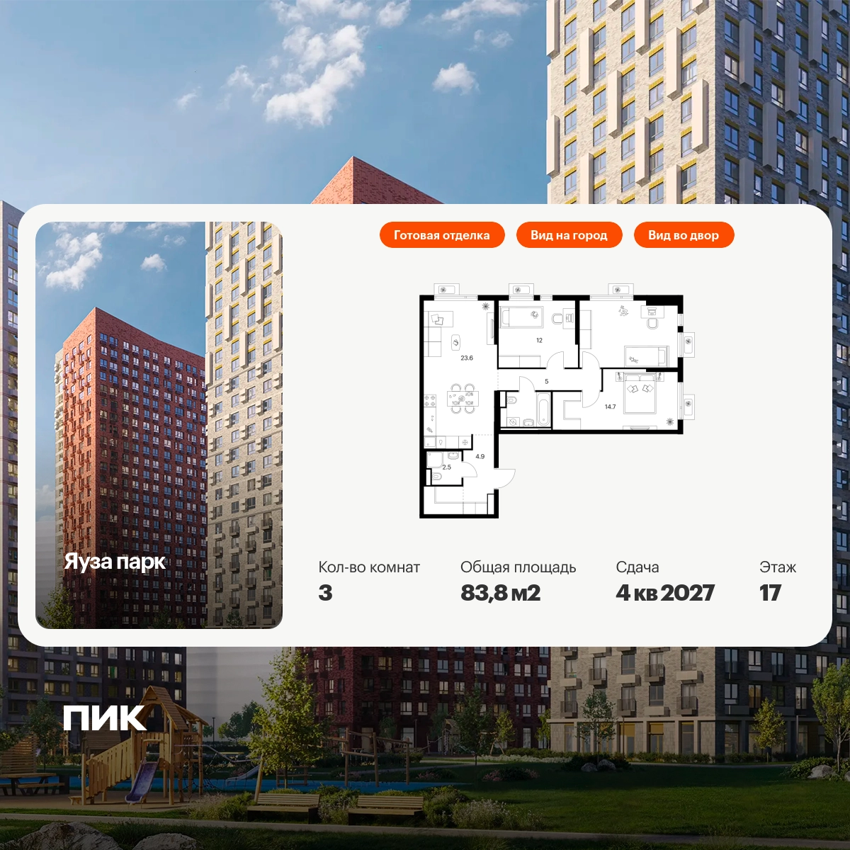 В Мытищах Московской области продаётся 3-комнатная квартира квартира площадью 83.8 на 17 этаже 24 этажного дома (корпус 14, секция 1) в проекте ПИК «Яуза парк». Удобное расположение 5 минут пешком до ж/д станции Мытищи и 20 минут на автомобиле до метро «Медведково». 3 минуты на автомобиле до Ярославского шоссе и 10 минут до МКАД. 8 минут пешком до ТРЦ «Красный кит». 20 минут пешком набережной реки Яузы и Мытищинского парка культуры и отдыха. Особенности проекта «Яуза парк» — современный квартал с архитектурой от бюро KATARSIS и RHIZOME. В проекте будет вся необходимая инфраструктура. А удобные и разнообразные планировки позволят каждому выбрать квартиру для собственного сценария жизни. Преимущества проекта: Отделка:Готовая Особенности планировки: Гардеробная, Кухня-гостиная, Два и более санузла, Умная планировка Два детских сада на 225 и 350 мест, школа для 1170 учеников и поликлиника на территории проекта. Дворы-парки с детскими и спортивными площадками. Пешеходный бульвар для прогулок и отдыха с отреставрированной водонапорной башней XIX века. Магазины, кафе и полезные сервисы на первых этажах домов. Многоуровневые и подземный паркинги. АртикулО застройщике