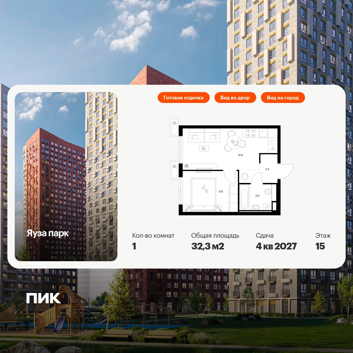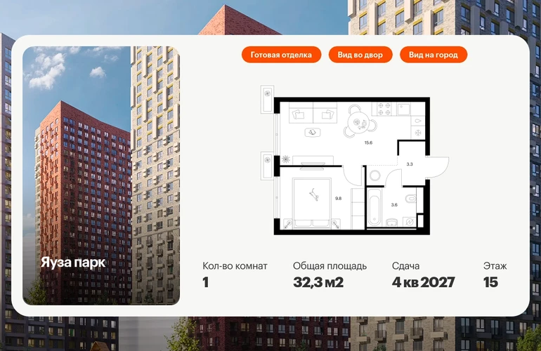 В Мытищах Московской области продаётся 1-комнатная квартира квартира площадью 32.3 на 15 этаже 15 этажного дома (корпус 13, секция 2) в проекте ПИК «Яуза парк». Удобное расположение 5 минут пешком до ж/д станции Мытищи и 20 минут на автомобиле до метро «Медведково». 3 минуты на автомобиле до Ярославского шоссе и 10 минут до МКАД. 8 минут пешком до ТРЦ «Красный кит». 20 минут пешком набережной реки Яузы и Мытищинского парка культуры и отдыха. Особенности проекта «Яуза парк» — современный квартал с архитектурой от известных бюро. В проекте будет вся необходимая инфраструктура. А удобные и разнообразные планировки позволят каждому выбрать квартиру для собственного сценария жизни. Преимущества проекта: Отделка: Два детских сада на 225 и 350 мест, школа для 1170 учеников и поликлиника на территории проекта. Дворы-парки с детскими и спортивными площадками. Пешеходный бульвар для прогулок и отдыха с отреставрированной водонапорной башней XIX века. Магазины, кафе и полезные сервисы на первых этажах домов. Многоуровневые и подземный паркинги. АртикулО застройщике