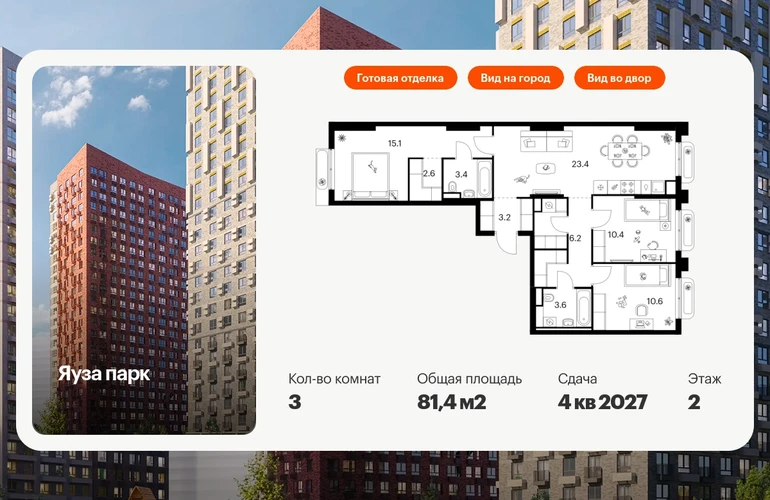 В Мытищах Московской области продаётся 3-комнатная квартира квартира площадью 81.4 на 2 этаже 15 этажного дома (корпус 13, секция 3) в проекте ПИК «Яуза парк». Удобное расположение 5 минут пешком до ж/д станции Мытищи и 20 минут на автомобиле до метро «Медведково». 3 минуты на автомобиле до Ярославского шоссе и 10 минут до МКАД. 8 минут пешком до ТРЦ «Красный кит». 20 минут пешком набережной реки Яузы и Мытищинского парка культуры и отдыха. Особенности проекта «Яуза парк» — современный квартал с архитектурой от бюро KATARSIS и RHIZOME. В проекте будет вся необходимая инфраструктура. А удобные и разнообразные планировки позволят каждому выбрать квартиру для собственного сценария жизни. Преимущества проекта: Отделка:Готовая Особенности планировки: Гардеробная, Постирочная, Мастер-спальня, Разнесенные спальни, Кухня-гостиная, Два и более санузла, Умная планировка Два детских сада на 225 и 350 мест, школа для 1170 учеников и поликлиника на территории проекта. Дворы-парки с детскими и спортивными площадками. Пешеходный бульвар для прогулок и отдыха с отреставрированной водонапорной башней XIX века. Магазины, кафе и полезные сервисы на первых этажах домов. Многоуровневые и подземный паркинги. АртикулО застройщике