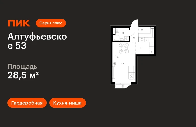 В Алтуфьевском районе продаётся студия квартира площадью 28.5 на 4 этаже 32 этажного дома (корпус, секция) в проекте ПИК «Алтуфьевское 53». Удобное расположение 15 минут на общественном транспорте до станции метро «Отрадное». 20 минут пешком до МЦД «Дегунино». 2 минуты на автомобиле до Алтуфьевского шоссе и 20 минут до ТТК. 9 минут на машине до Ботанического сада и ВДНХ. Особенности проекта «Алтуфьевское 53» — современный проект «Серии плюс» с авторской архитектурой в районе, где создана качественная среда для полноценной жизни, работы и отдыха. А удобные и разнообразные планировки позволят каждому выбрать квартиру для собственного сценария жизни. Преимущества проекта: Отделка: Готовая Особенности планировки: Гардеробная, Кухня-ниша, Умная планировка Лобби с дизайнерской отделкой, зонами ожидания, гостевыми санузлами и колясочными. Два детских сада с бассейном для 200 и 225 малышей и школа для 1000 учеников в минуте ходьбы от проекта. Дворы-парки с местами для отдыха, игровыми и спортивными площадками. Подземный паркинг. АртикулО застройщике