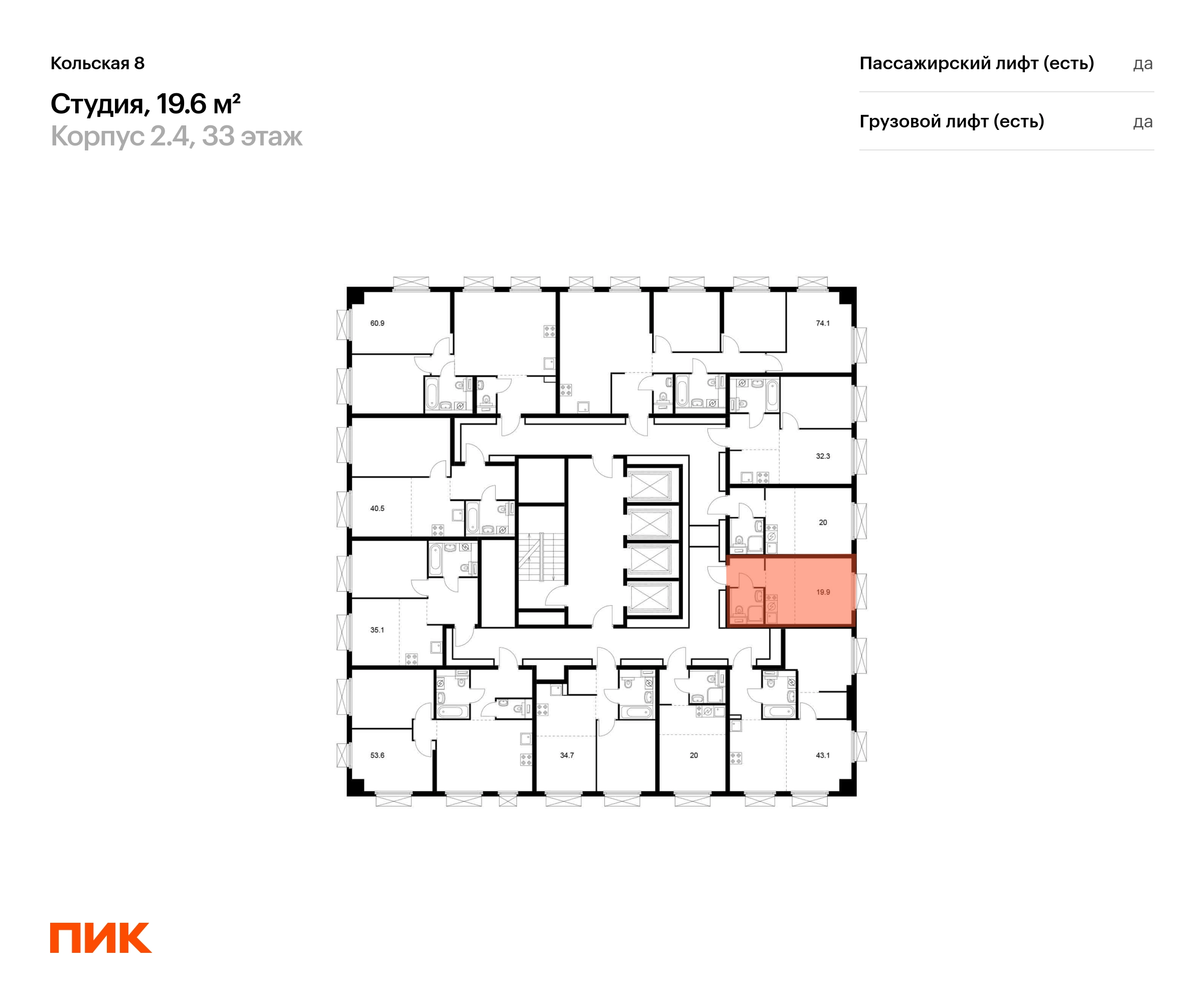 Продаётся квартира-студия площадью 19.60 кв.м на 33 этаже 33 этажного дома (Корпус 2.4, секция 1) проекта ПИК Кольская 8. Светлый просторный подъезд на уровне земли, функциональная планировка, большие окна, с отделкой. Жилой квартал «Кольская 8» строится в Бабушкинском районе, в 8 минутах пешком от метро «Свиблово». До Ярославского шоссе на машине — 8 минут, а до ТТК — 16. До нескольких парков и набережной реки Яузы можно дойти пешком. В проекте два жилых блока с подземными паркингами, школа и детский сад. В зелёных дворах-парках будут места для отдыха, современные детские и спортивные площадки. На первых этажах откроются магазины, кафе и другие сервисы — за кофе и свежим хлебом к завтраку можно будет просто спуститься на лифте. Рядом с кварталом есть всё для комфортной жизни: в 8 минутах неспешным шагом — благоустроенные парки Яуза и Свиблово, а до Ботанического сада можно доехать за 7 минут на машине. Недалеко от проекта находятся детские сады, школы, поликлиники, магазины и торговые центры. Артикул - 834102О застройщике