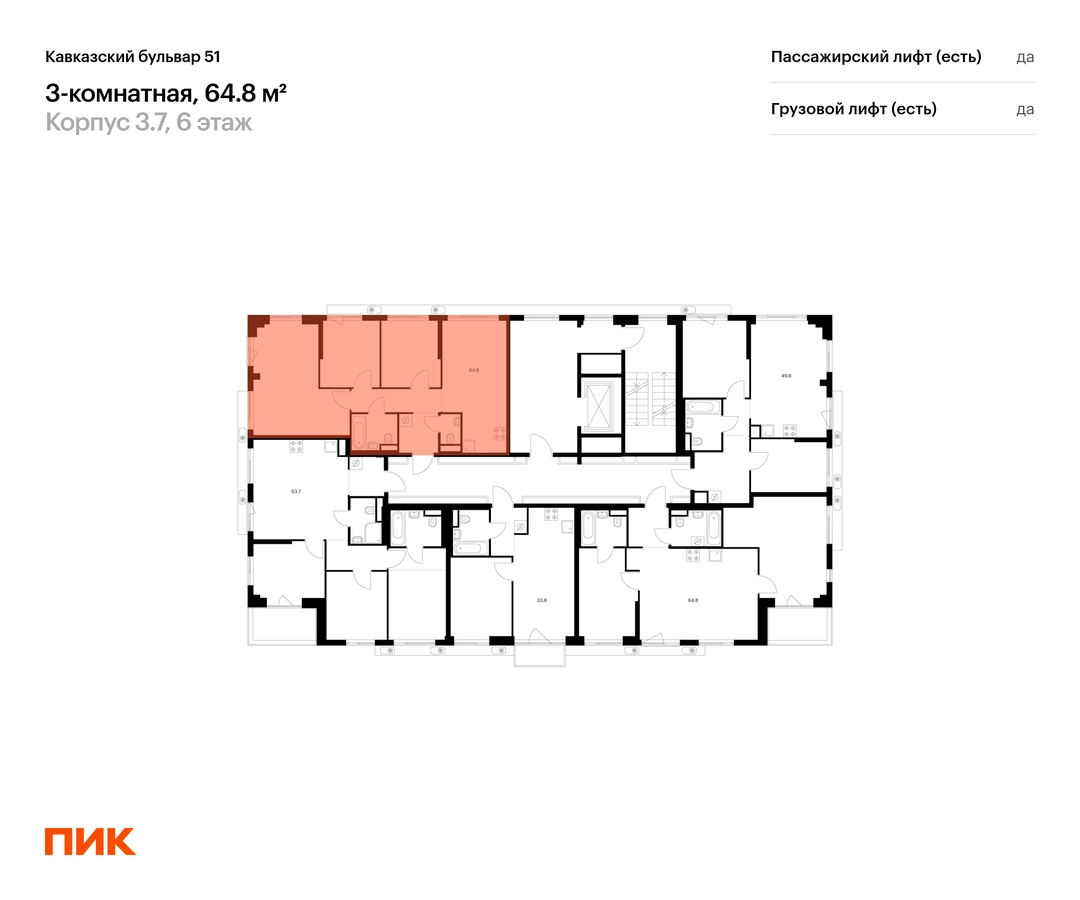 В районе Царицыно продаётся 3-комнатная квартира квартира площадью 64.8 на 6 этаже 7 этажного дома (корпус, секция) в проекте ПИК «Кавказский бульвар 51». Удобное расположение 17 минут пешком до станции метро «Кантемировская» и 20 минут до станции «Чертаново». 10 минут на машине до МКАД, 11 минут до Варшавского шоссе и 16 минут до ТТК. 8 минут пешком до Аршиновского и 13 минут до парка «Сосенки». 9 минут на автомобиле до музея-заповедника «Царицыно». Особенности проекта «Кавказский бульвар 51» — современный квартал в районе Царицыно. Проект частично реализован: первые дома уже сданы, а на первых этажах открыты магазины и полезные сервисы. В корпусах «Серии плюс» вас ждут продуманные планировки с мастер-спальней, кухней-гостиной и гардеробной. Преимущества проекта: Отделка: Предчистовая Особенности планировки: Кухня-гостиная, Два и более санузла, Французский балкон, Окна в пол, Внутрипольные конвекторы Дизайнерские лобби с быстрыми и тихими лифтами, кондиционерами, зонами ожидания и колясочными. Детский сад для 250 малышей и школа для 900 учеников на территории проекта. Пешеходный бульвар с местами для отдыха, игровыми и спортивными площадками. SportPark с футбольным и волейбольным полем, тренажёрами и памп-треком. Многоуровневый и подземные паркинги. Артикул _О застройщике