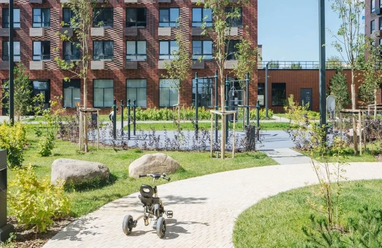 Во дворе «Ютаново» будет собственный парк с местами для отдыха, детскими и спортивными площадками. На первых этажах откроются магазины, кафе и другие сервисы.
