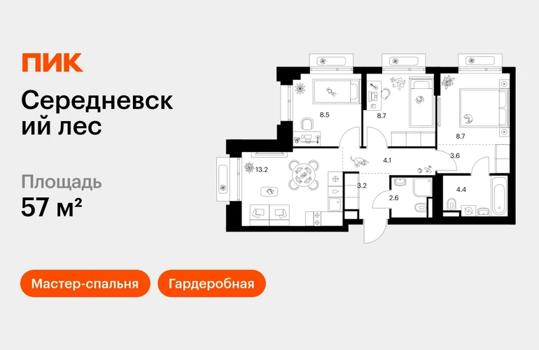 В Новой Москве продаётся 3-комнатная квартира квартира площадью 57 на 15 этаже 16 этажного дома (корпус, секция) в проекте ПИК «Середневский лес». Удобное расположение: 10–15 минут на автомобиле до станций метро «Аэропорт Внуково» и «Филатов луг». 18 минут на машине до МЦД-4 «Толстопальцево». 5 минут на автомобиле до Киевского шоссе и 18 минут до МКАД. 5 минут пешком до Валуевского леса. Особенности проекта «Середневский лес» — тихий и зелёный квартал в экологичном районе столицы с домами до 16 этажей. Дома в проекте отличаются современной архитектурой: цветовые решения фасадов выдержаны в тёплой гамме, а витражное остекление на входе в подъезды наполняет просторные холлы естественным светом. Преимущества проекта: Отделка: с чистовой отделкой Особенности планировки: Гардеробная, Мастер-спальня, Два и более санузла, Умная планировка Светлые холлы с двумя входами и быстрыми бесшумными лифтами. Школа на 1100 мест и два детских сада на 665 мест. Общественное пространство с игровыми площадками, местами для отдыха, пешеходными маршрутами и велопарковкой. Наземный паркинг. АртикулО застройщике