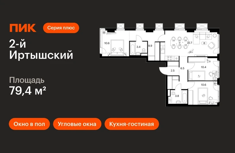 В районе Гольяново продаётся 3-комнатная квартира квартира площадью 79.4 кв. м на 9 этаже 9 этажного дома (корпус, секция) в проекте ПИК «2-й Иртышский». Удобное расположение 25 минут пешком до станции метро «Черкизовская» 14 минут на автомобиле до МКАД и 20 минут до ТТК 12 минут на машине до ТРЦ «Щёлковский» 15 минут пешком до «Сиреневого сада» и 6 минут на автомобиле до «Лосиного острова» и Гольяновского пруда Особенности проекта «2-й Иртышский» — современный проект с корпусами «Серии плюс» в районе, где создана качественная среда для полноценной жизни, работы и отдыха. А удобные и разнообразные планировки позволят каждому выбрать квартиру для собственного сценария жизни. Преимущества проекта: Отделка:Готовая Особенности планировки: Гардеробная, Мастер-спальня, Разнесенные спальни, Кухня-ниша, Кухня-гостиная, Два и более санузла, Окна в пол, Угловые окна, Окно в гардеробной, Внутрипольные конвекторы, Умная планировка Лобби с дизайнерской отделкой, зонами ожидания и колясочными. Детский сад для 350 малышей и школа на 950 мест. Пешеходный бульвар для неспешных прогулок и отдыха. Подземный паркинг. АртикулО застройщике