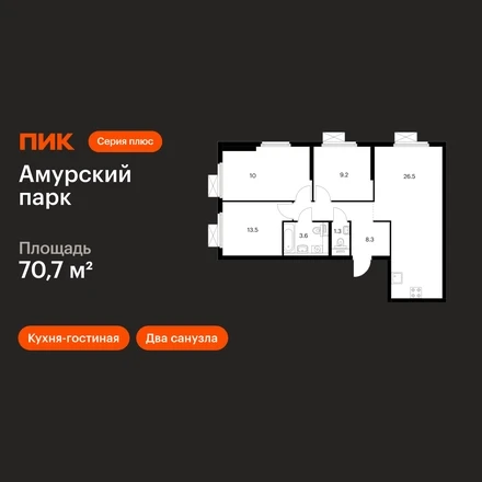 В районе Гольяново продаётся 3-комнатная квартира квартира площадью70.7 на 2 этаже 28 этажного дома (1.2 корпус, 2 секция) в проекте ПИК «Амурский парк». Удобное расположение 10 минут пешком до станции метро «Черкизовская» и МЦК «Локомотив». 15 минут на автомобиле до ТТК или МКАД, 17 минут до Садового кольца. 8 минут пешком до Сиреневого сада и 20 минут до Детского Черкизовского парка. 10 минут на автомобиле до парка «Лосиный остров». Особенности проекта «Амурский парк» — квартал с видом на Измайловский парк на востоке Москвы. Проект выглядит ярко и современно благодаря уникальным фасадам зданий. А удобные и разнообразные планировки позволят каждому выбрать квартиру для собственного сценария жизни. Преимущества проекта: Отделка: Готовая Особенности планировки: Кухня-гостиная, Два и более санузла Дизайнерские лобби с быстрыми и тихими лифтами, зонами ожидания и колясочными. Детский сад с бассейном для 250 малышей на территории проекта. Дворы-парки с местами для отдыха, игровыми и спортивными площадками. На первых этажах домов — магазины, кафе и полезные сервисы. Подземный паркинг. Артикул _О застройщике