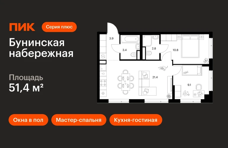 В Новой Москве продаётся 2-комнатная квартира квартира площадью 51.4 на 5 этаже 16 этажного дома (корпус 2.6/1.4, секция 4) в проекте ПИК «Бунинская набережная». Удобное расположение 18 минут пешком до станции метро «Потапово» и 12 минут на машине до метро «Бунинская аллея». 9 минут на машине до Солнцево-Бутово-Варшавского шоссе и 17 минут до МКАД. 8 минут на автомобиле до гипермаркета «Глобус». 15 минут на автомобиле до живописного Бутовского лесопарка и заказника «Южное Бутово». Особенности проекта «Бунинская набережная» — камерный квартал «Серии плюс» на берегу Ивановского пруда. В шаговой доступности вся нужная инфраструктура: детские сады, школы, поликлиники, игровая площадка PlayHub «Пирамиды» и скейт-парк. Удобные и разнообразные планировки позволят каждому выбрать квартиру для собственного сценария жизни. Преимущества проекта: Отделка: Готовая Особенности планировки: Мастер-спальня, Кухня-гостиная, Два и более санузла, Окна в пол, Внутрипольные конвекторы, Умная планировка Просторные и светлые лобби с быстрыми тихими лифтами. Дворы-парки с местами для отдыха, детскими и спортивными площадками. Пешеходный бульвар и благоустроенная набережная. Магазины, кафе и полезные сервисы на первых этажах домов. Подземный паркинг. АртикулО застройщике