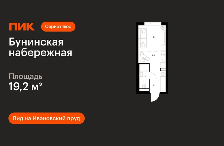 В Новой Москве продаётся студия квартира площадью 19.2 на 12 этаже 16 этажного дома (корпус 2.6/1.4, секция 4) в проекте ПИК «Бунинская набережная». Удобное расположение 18 минут пешком до станции метро «Потапово» и 12 минут на машине до метро «Бунинская аллея». 9 минут на машине до Солнцево-Бутово-Варшавского шоссе и 17 минут до МКАД. 8 минут на автомобиле до гипермаркета «Глобус». 15 минут на автомобиле до живописного Бутовского лесопарка и заказника «Южное Бутово». Особенности проекта «Бунинская набережная» — камерный квартал «Серии плюс» на берегу Ивановского пруда. В шаговой доступности вся нужная инфраструктура: детские сады, школы, поликлиники, игровая площадка ПлейХаб «Пирамиды» и скейт-парк. Удобные и разнообразные планировки позволят каждому выбрать квартиру для собственного сценария жизни. Преимущества проекта: Отделка: Готовая Особенности планировки: Вид на Ивановский пруд Просторные и светлые лобби с быстрыми тихими лифтами. Дворы-парки с местами для отдыха, детскими и спортивными площадками. Пешеходный бульвар и благоустроенная набережная. Магазины, кафе и полезные сервисы на первых этажах домов. Подземный паркинг. АртикулО застройщике