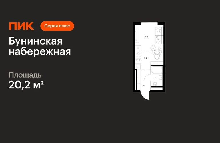 В Новой Москве продаётся студия квартира площадью 20.2 на 9 этаже 16 этажного дома (корпус 2.6/1.2, секция 2) в проекте ПИК «Бунинская набережная». Удобное расположение 18 минут пешком до станции метро «Потапово» и 12 минут на машине до метро «Бунинская аллея». 9 минут на машине до Солнцево-Бутово-Варшавского шоссе и 17 минут до МКАД. 8 минут на автомобиле до гипермаркета «Глобус». 15 минут на автомобиле до живописного Бутовского лесопарка и заказника «Южное Бутово». Особенности проекта «Бунинская набережная» — камерный квартал «Серии плюс» на берегу Ивановского пруда. В шаговой доступности вся нужная инфраструктура: детские сады, школы, поликлиники, игровая площадка PlayHub «Пирамиды» и скейт-парк. Удобные и разнообразные планировки позволят каждому выбрать квартиру для собственного сценария жизни. Преимущества проекта: Отделка: Предчистовая Просторные и светлые лобби с быстрыми тихими лифтами. Дворы-парки с местами для отдыха, детскими и спортивными площадками. Пешеходный бульвар и благоустроенная набережная. Магазины, кафе и полезные сервисы на первых этажах домов. Подземный паркинг. АртикулО застройщике