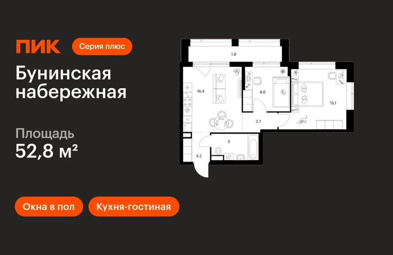 В Новой Москве продаётся 2-комнатная квартира квартира площадью 52.8 на 7 этаже 16 этажного дома (корпус 2.6/1.3, секция 3) в проекте ПИК «Бунинская набережная». Удобное расположение 18 минут пешком до станции метро «Потапово» и 12 минут на машине до метро «Бунинская аллея». 9 минут на машине до Солнцево-Бутово-Варшавского шоссе и 17 минут до МКАД. 8 минут на автомобиле до гипермаркета «Глобус». 15 минут на автомобиле до живописного Бутовского лесопарка и заказника «Южное Бутово». Особенности проекта «Бунинская набережная» — камерный квартал «Серии плюс» на берегу Ивановского пруда. В шаговой доступности вся нужная инфраструктура: детские сады, школы, поликлиники, игровая площадка ПлейХаб «Пирамиды» и скейт-парк. Удобные и разнообразные планировки позволят каждому выбрать квартиру для собственного сценария жизни. Преимущества проекта: Отделка: Готовая Особенности планировки: Кухня-гостиная, Закрытый балкон, Окна в пол, Внутрипольные конвекторы Просторные и светлые лобби с быстрыми тихими лифтами. Дворы-парки с местами для отдыха, детскими и спортивными площадками. Пешеходный бульвар и благоустроенная набережная. Магазины, кафе и полезные сервисы на первых этажах домов. Подземный паркинг. АртикулО застройщике