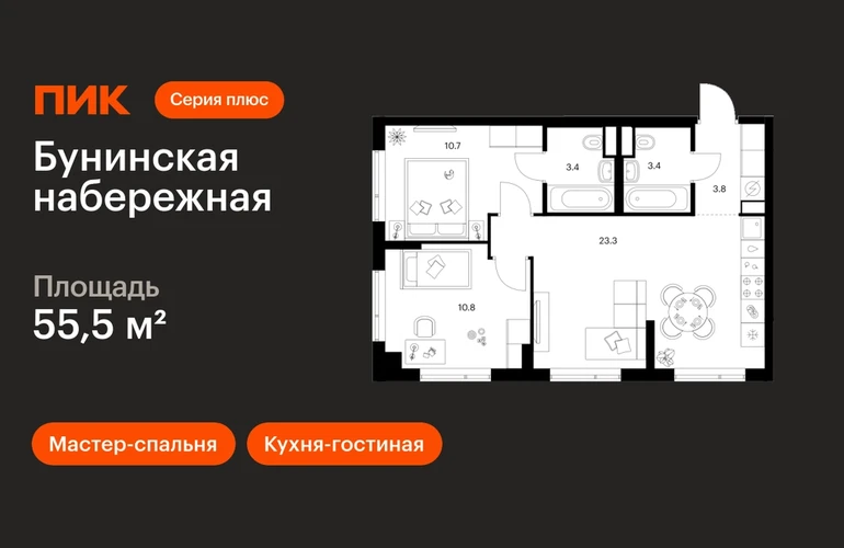 В Новой Москве продаётся 2-комнатная квартира квартира площадью 55.5 на 2 этаже 16 этажного дома (корпус 2.6/1.1, секция 1) в проекте ПИК «Бунинская набережная». Удобное расположение 18 минут пешком до станции метро «Потапово» и 12 минут на машине до метро «Бунинская аллея». 9 минут на машине до Солнцево-Бутово-Варшавского шоссе и 17 минут до МКАД. 8 минут на автомобиле до гипермаркета «Глобус». 15 минут на автомобиле до живописного Бутовского лесопарка и заказника «Южное Бутово». Особенности проекта «Бунинская набережная» — камерный квартал «Серии плюс» на берегу Ивановского пруда. В шаговой доступности вся нужная инфраструктура: детские сады, школы, поликлиники, игровая площадка PlayHub «Пирамиды» и скейт-парк. Удобные и разнообразные планировки позволят каждому выбрать квартиру для собственного сценария жизни. Преимущества проекта: Отделка: Готовая Особенности планировки: Мастер-спальня, Кухня-гостиная, Два и более санузла, Умная планировка Просторные и светлые лобби с быстрыми тихими лифтами. Дворы-парки с местами для отдыха, детскими и спортивными площадками. Пешеходный бульвар и благоустроенная набережная. Магазины, кафе и полезные сервисы на первых этажах домов. Подземный паркинг. АртикулО застройщике