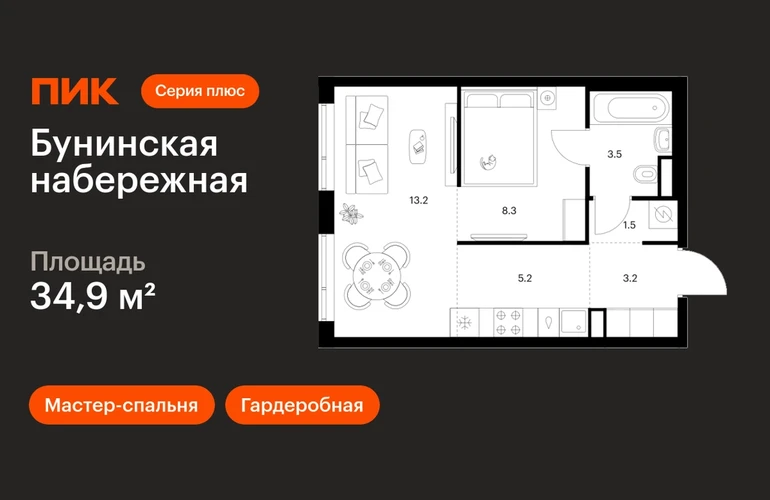 В Новой Москве продаётся 1-комнатная квартира квартира площадью 34.9 на 2 этаже 16 этажного дома (корпус 2.6/1.4, секция 4) в проекте ПИК «Бунинская набережная». Удобное расположение 18 минут пешком до станции метро «Потапово» и 12 минут на машине до метро «Бунинская аллея». 9 минут на машине до Солнцево-Бутово-Варшавского шоссе и 17 минут до МКАД. 8 минут на автомобиле до гипермаркета «Глобус». 15 минут на автомобиле до живописного Бутовского лесопарка и заказника «Южное Бутово». Особенности проекта «Бунинская набережная» — камерный квартал «Серии плюс» на берегу Ивановского пруда. В шаговой доступности вся нужная инфраструктура: детские сады, школы, поликлиники, игровая площадка ПлейХаб «Пирамиды» и скейт-парк. Удобные и разнообразные планировки позволят каждому выбрать квартиру для собственного сценария жизни. Преимущества проекта: Отделка: Готовая Особенности планировки: Гардеробная, Мастер-спальня, Сквозной санузел, Умная планировка Просторные и светлые лобби с быстрыми тихими лифтами. Дворы-парки с местами для отдыха, детскими и спортивными площадками. Пешеходный бульвар и благоустроенная набережная. Магазины, кафе и полезные сервисы на первых этажах домов. Подземный паркинг. АртикулО застройщике