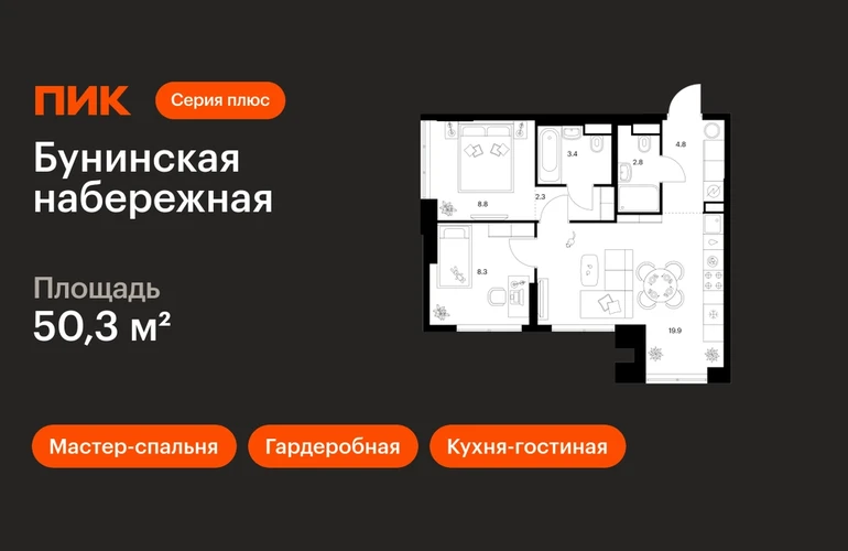 В Новой Москве продаётся 2-комнатная квартира квартира площадью 50.3 на 1 этаже 16 этажного дома (корпус 2.6/1.1, секция 1) в проекте ПИК «Бунинская набережная». Удобное расположение 18 минут пешком до станции метро «Потапово» и 12 минут на машине до метро «Бунинская аллея». 9 минут на машине до Солнцево-Бутово-Варшавского шоссе и 17 минут до МКАД. 8 минут на автомобиле до гипермаркета «Глобус». 15 минут на автомобиле до живописного Бутовского лесопарка и заказника «Южное Бутово». Особенности проекта «Бунинская набережная» — камерный квартал «Серии плюс» на берегу Ивановского пруда. В шаговой доступности вся нужная инфраструктура: детские сады, школы, поликлиники, игровая площадка PlayHub «Пирамиды» и скейт-парк. Удобные и разнообразные планировки позволят каждому выбрать квартиру для собственного сценария жизни. Преимущества проекта: Отделка: Готовая Особенности планировки: Гардеробная, Мастер-спальня, Кухня-гостиная, Два и более санузла, Внутрипольные конвекторы, Умная планировка Просторные и светлые лобби с быстрыми тихими лифтами. Дворы-парки с местами для отдыха, детскими и спортивными площадками. Пешеходный бульвар и благоустроенная набережная. Магазины, кафе и полезные сервисы на первых этажах домов. Подземный паркинг. АртикулО застройщике