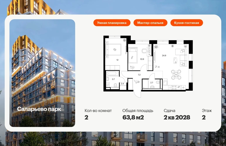 Продаётся 2-комн.квартира площадью 63.80 кв.м на 2 этаже 14 этажного дома (Корпус 57.5, секция 5) проекта ПИК Саларьево парк. Светлый просторный подъезд на уровне земли, функциональная планировка, большие окна, с отделкой. Жилой район «Саларьево парк» расположен в Новой Москве, в четырёх километрах от МКАД по Киевскому шоссе. Две станции метро: «Саларьево» и «Филатов луг», — находятся в пешей доступности от проекта. Дойти до них можно за 5–10 минут. В квартале уже создана качественная среда, где есть абсолютно всё для полноценной жизни, работы и отдыха. «Саларьево парк» — не просто квартал, а полноценный жилой район, который отличается разноплановой архитектурой. Над концепцией квартала работали несколько ведущих архитектурных бюро, которые стремились добиться разнообразия в фасадных решениях. Ярким примером такого подхода станут корпуса 82 и 83, которые относятся к «Серии плюс». Новый корпус 83 был создан по принципам южной архитектуры: расслабленный и лаконичный силуэт зданий, привлекающий к себе внимание. Архитектурная изюминка 83-го корпуса — террасы и фигурные балконы. Вместе с окнами и другими акцентными элементами они создают уникальный облик здания, отсылая нас к изысканной южной архитектуре. Все корпуса в квартале гармонично сочетаются, образуя единую городскую среду. Здесь приятно гулять и проводить время на улице всей семьёй. В «Саларьево парке» создана уникальная образовательная среда, включающая в себя шесть школ, рассчитанных на 6 250 учеников. Четыре из них уже открыты, их посещает 2 300 детей. Также на территории «Саларьево парка» находится 12 детских садов, один из которых с бассейном. Сейчас уже открыты 8 садов. В «Саларьево парке» открыта уникальная игровая площадка — ПлейХаб «Оригами». Здесь есть ручей, горка-труба и рельефные холмы. Взрослые смогут отдохнуть в уютном кафе, пока дети играют. Также на территории проекта есть СпортХаб — большая спортивная зона, разделённая по интересам и возрастам. Здесь можно заниматься разными видами спорта: футболом, баскетболом, волейболом и стритболом. Зимой центральную часть площадки превращают в каток. Во дворах-парках жилого квартала есть места для отдыха, детские и спортивные площадки. На первых этажах домов расположены магазины, кафе и полезные сервисы. Также вблизи проекта есть несколько масштабных торговых центров. До ТЦ «Саларис» пять минут пешком, до «Рио» и «Лемана Про» — пять минут на автомобиле. Артикул - 1018686О застройщике