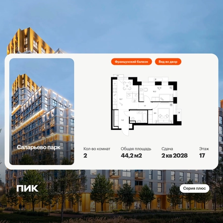 Продаётся 2-комн.квартира площадью 44.20 кв.м на 17 этаже 22 этажного дома (Корпус 57.3, секция 3) проекта ПИК Саларьево парк. Светлый просторный подъезд на уровне земли, функциональная планировка, большие окна, с отделкой. Жилой район «Саларьево парк» расположен в Новой Москве, в четырёх километрах от МКАД по Киевскому шоссе. Две станции метро: «Саларьево» и «Филатов луг», — находятся в пешей доступности от проекта. Дойти до них можно за 5–10 минут. В квартале уже создана качественная среда, где есть абсолютно всё для полноценной жизни, работы и отдыха. «Саларьево парк» — не просто квартал, а полноценный жилой район, который отличается разноплановой архитектурой. Над концепцией квартала работали несколько ведущих архитектурных бюро, которые стремились добиться разнообразия в фасадных решениях. Ярким примером такого подхода станут корпуса 82 и 83, которые относятся к «Серии плюс». Новый корпус 83 был создан по принципам южной архитектуры: расслабленный и лаконичный силуэт зданий, привлекающий к себе внимание. Архитектурная изюминка 83-го корпуса — террасы и фигурные балконы. Вместе с окнами и другими акцентными элементами они создают уникальный облик здания, отсылая нас к изысканной южной архитектуре. Все корпуса в квартале гармонично сочетаются, образуя единую городскую среду. Здесь приятно гулять и проводить время на улице всей семьёй. В «Саларьево парке» создана уникальная образовательная среда, включающая в себя шесть школ, рассчитанных на 6 250 учеников. Четыре из них уже открыты, их посещает 2 300 детей. Также на территории «Саларьево парка» находится 12 детских садов, один из которых с бассейном. Сейчас уже открыты 8 садов. В «Саларьево парке» открыта уникальная игровая площадка — PlayHub «Оригами». Здесь есть ручей, горка-труба и рельефные холмы. Взрослые смогут отдохнуть в уютном кафе, пока дети играют. Также на территории проекта есть SportHub — большая спортивная зона, разделённая по интересам и возрастам. Здесь можно заниматься разными видами спорта: футболом, баскетболом, волейболом и стритболом. Зимой центральную часть площадки превращают в каток. Во дворах-парках жилого квартала есть места для отдыха, детские и спортивные площадки. На первых этажах домов расположены магазины, кафе и полезные сервисы. Также вблизи проекта есть несколько масштабных торговых центров. До ТЦ «Саларис» пять минут пешком, до «Рио», Metro Cash & Carry и «Леруа Мерлен» — пять минут на автомобиле. Артикул - 1018487О застройщике