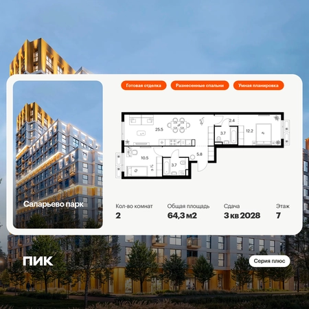 Продаётся 2-комн.квартира площадью 64.30 кв.м на 7 этаже 14 этажного дома (Корпус 69.7, секция 7) проекта ПИК Саларьево парк. Светлый просторный подъезд на уровне земли, функциональная планировка, большие окна, с отделкой. Жилой район «Саларьево парк» расположен в Новой Москве, в четырёх километрах от МКАД по Киевскому шоссе. Две станции метро: «Саларьево» и «Филатов луг», — находятся в пешей доступности от проекта. Дойти до них можно за 5–10 минут. В квартале уже создана качественная среда, где есть абсолютно всё для полноценной жизни, работы и отдыха. «Саларьево парк» — не просто квартал, а полноценный жилой район, который отличается разноплановой архитектурой. Над концепцией квартала работали несколько ведущих архитектурных бюро, которые стремились добиться разнообразия в фасадных решениях. Ярким примером такого подхода станут корпуса 82 и 83, которые относятся к «Серии плюс». Новый корпус 83 был создан по принципам южной архитектуры: расслабленный и лаконичный силуэт зданий, привлекающий к себе внимание. Архитектурная изюминка 83-го корпуса — террасы и фигурные балконы. Вместе с окнами и другими акцентными элементами они создают уникальный облик здания, отсылая нас к изысканной южной архитектуре. Все корпуса в квартале гармонично сочетаются, образуя единую городскую среду. Здесь приятно гулять и проводить время на улице всей семьёй. В «Саларьево парке» создана уникальная образовательная среда, включающая в себя шесть школ, рассчитанных на 6 250 учеников. Четыре из них уже открыты, их посещает 2 300 детей. Также на территории «Саларьево парка» находится 12 детских садов, один из которых с бассейном. Сейчас уже открыты 8 садов. В «Саларьево парке» открыта уникальная игровая площадка — ПлейХаб «Оригами». Здесь есть ручей, горка-труба и рельефные холмы. Взрослые смогут отдохнуть в уютном кафе, пока дети играют. Также на территории проекта есть СпортХаб — большая спортивная зона, разделённая по интересам и возрастам. Здесь можно заниматься разными видами спорта: футболом, баскетболом, волейболом и стритболом. Зимой центральную часть площадки превращают в каток. Во дворах-парках жилого квартала есть места для отдыха, детские и спортивные площадки. На первых этажах домов расположены магазины, кафе и полезные сервисы. Также вблизи проекта есть несколько масштабных торговых центров. До ТЦ «Саларис» пять минут пешком, до «Рио» и «Лемана Про» — пять минут на автомобиле. Артикул - 1024154О застройщике