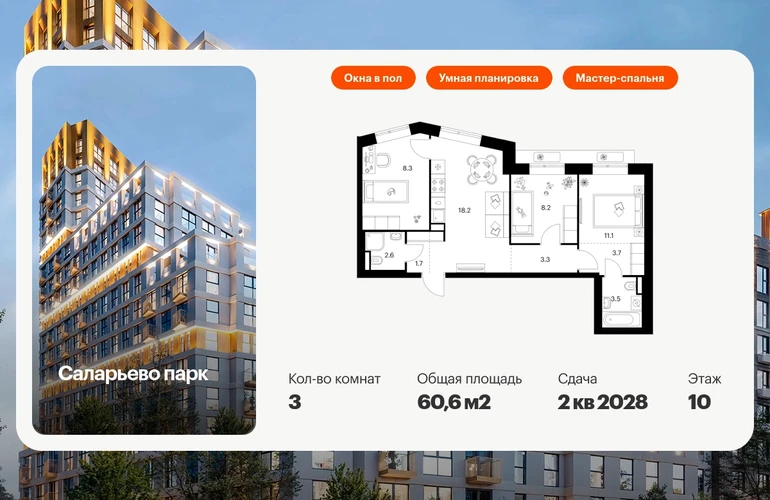 Продаётся 3-комн.квартира площадью 60.60 кв.м на 10 этаже 18 этажного дома (Корпус 74.4, секция 4) проекта ПИК Саларьево парк. Светлый просторный подъезд на уровне земли, функциональная планировка, большие окна, с отделкой. Жилой район «Саларьево парк» расположен в Новой Москве, в четырёх километрах от МКАД по Киевскому шоссе. Две станции метро: «Саларьево» и «Филатов луг», — находятся в пешей доступности от проекта. Дойти до них можно за 5–10 минут. В квартале уже создана качественная среда, где есть абсолютно всё для полноценной жизни, работы и отдыха. «Саларьево парк» — не просто квартал, а полноценный жилой район, который отличается разноплановой архитектурой. Над концепцией квартала работали несколько ведущих архитектурных бюро, которые стремились добиться разнообразия в фасадных решениях. Ярким примером такого подхода станут корпуса 82 и 83, которые относятся к «Серии плюс». Новый корпус 83 был создан по принципам южной архитектуры: расслабленный и лаконичный силуэт зданий, привлекающий к себе внимание. Архитектурная изюминка 83-го корпуса — террасы и фигурные балконы. Вместе с окнами и другими акцентными элементами они создают уникальный облик здания, отсылая нас к изысканной южной архитектуре. Все корпуса в квартале гармонично сочетаются, образуя единую городскую среду. Здесь приятно гулять и проводить время на улице всей семьёй. В «Саларьево парке» создана уникальная образовательная среда, включающая в себя шесть школ, рассчитанных на 6 250 учеников. Четыре из них уже открыты, их посещает 2 300 детей. Также на территории «Саларьево парка» находится 12 детских садов, один из которых с бассейном. Сейчас уже открыты 8 садов. В «Саларьево парке» открыта уникальная игровая площадка — PlayHub «Оригами». Здесь есть ручей, горка-труба и рельефные холмы. Взрослые смогут отдохнуть в уютном кафе, пока дети играют. Также на территории проекта есть SportHub — большая спортивная зона, разделённая по интересам и возрастам. Здесь можно заниматься разными видами спорта: футболом, баскетболом, волейболом и стритболом. Зимой центральную часть площадки превращают в каток. Во дворах-парках жилого квартала есть места для отдыха, детские и спортивные площадки. На первых этажах домов расположены магазины, кафе и полезные сервисы. Также вблизи проекта есть несколько масштабных торговых центров. До ТЦ «Саларис» пять минут пешком, до «Рио», Metro Cash & Carry и «Леруа Мерлен» — пять минут на автомобиле. Артикул - 1006575О застройщике