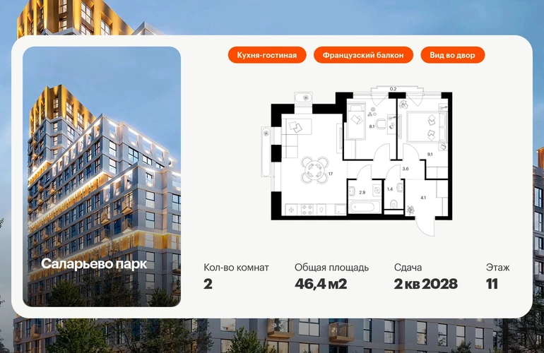 Продаётся 2-комн.квартира площадью 46.40 кв.м на 11 этаже 16 этажного дома (Корпус 57.4, секция 4) проекта ПИК Саларьево парк. Светлый просторный подъезд на уровне земли, функциональная планировка, большие окна, с отделкой. Жилой район «Саларьево парк» расположен в Новой Москве, в четырёх километрах от МКАД по Киевскому шоссе. Две станции метро: «Саларьево» и «Филатов луг», — находятся в пешей доступности от проекта. Дойти до них можно за 5–10 минут. В квартале уже создана качественная среда, где есть абсолютно всё для полноценной жизни, работы и отдыха. «Саларьево парк» — не просто квартал, а полноценный жилой район, который отличается разноплановой архитектурой. Над концепцией квартала работали несколько ведущих архитектурных бюро, которые стремились добиться разнообразия в фасадных решениях. Ярким примером такого подхода станут корпуса 82 и 83, которые относятся к «Серии плюс». Новый корпус 83 был создан по принципам южной архитектуры: расслабленный и лаконичный силуэт зданий, привлекающий к себе внимание. Архитектурная изюминка 83-го корпуса — террасы и фигурные балконы. Вместе с окнами и другими акцентными элементами они создают уникальный облик здания, отсылая нас к изысканной южной архитектуре. Все корпуса в квартале гармонично сочетаются, образуя единую городскую среду. Здесь приятно гулять и проводить время на улице всей семьёй. В «Саларьево парке» создана уникальная образовательная среда, включающая в себя шесть школ, рассчитанных на 6 250 учеников. Четыре из них уже открыты, их посещает 2 300 детей. Также на территории «Саларьево парка» находится 12 детских садов, один из которых с бассейном. Сейчас уже открыты 8 садов. В «Саларьево парке» открыта уникальная игровая площадка — PlayHub «Оригами». Здесь есть ручей, горка-труба и рельефные холмы. Взрослые смогут отдохнуть в уютном кафе, пока дети играют. Также на территории проекта есть SportHub — большая спортивная зона, разделённая по интересам и возрастам. Здесь можно заниматься разными видами спорта: футболом, баскетболом, волейболом и стритболом. Зимой центральную часть площадки превращают в каток. Во дворах-парках жилого квартала есть места для отдыха, детские и спортивные площадки. На первых этажах домов расположены магазины, кафе и полезные сервисы. Также вблизи проекта есть несколько масштабных торговых центров. До ТЦ «Саларис» пять минут пешком, до «Рио», Metro Cash & Carry и «Леруа Мерлен» — пять минут на автомобиле. Артикул - 1018634О застройщике