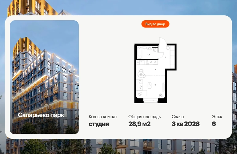 Продаётся квартира-студия площадью 28.90 кв.м на 6 этаже 23 этажного дома (Корпус 69.1, секция 1) проекта ПИК Саларьево парк. Светлый просторный подъезд на уровне земли, функциональная планировка, большие окна, с отделкой. Жилой район «Саларьево парк» расположен в Новой Москве, в четырёх километрах от МКАД по Киевскому шоссе. Две станции метро: «Саларьево» и «Филатов луг», — находятся в пешей доступности от проекта. Дойти до них можно за 5–10 минут. В квартале уже создана качественная среда, где есть абсолютно всё для полноценной жизни, работы и отдыха. «Саларьево парк» — не просто квартал, а полноценный жилой район, который отличается разноплановой архитектурой. Над концепцией квартала работали несколько ведущих архитектурных бюро, которые стремились добиться разнообразия в фасадных решениях. Ярким примером такого подхода станут корпуса 82 и 83, которые относятся к «Серии плюс». Новый корпус 83 был создан по принципам южной архитектуры: расслабленный и лаконичный силуэт зданий, привлекающий к себе внимание. Архитектурная изюминка 83-го корпуса — террасы и фигурные балконы. Вместе с окнами и другими акцентными элементами они создают уникальный облик здания, отсылая нас к изысканной южной архитектуре. Все корпуса в квартале гармонично сочетаются, образуя единую городскую среду. Здесь приятно гулять и проводить время на улице всей семьёй. В «Саларьево парке» создана уникальная образовательная среда, включающая в себя шесть школ, рассчитанных на 6 250 учеников. Четыре из них уже открыты, их посещает 2 300 детей. Также на территории «Саларьево парка» находится 12 детских садов, один из которых с бассейном. Сейчас уже открыты 8 садов. В «Саларьево парке» открыта уникальная игровая площадка — PlayHub «Оригами». Здесь есть ручей, горка-труба и рельефные холмы. Взрослые смогут отдохнуть в уютном кафе, пока дети играют. Также на территории проекта есть SportHub — большая спортивная зона, разделённая по интересам и возрастам. Здесь можно заниматься разными видами спорта: футболом, баскетболом, волейболом и стритболом. Зимой центральную часть площадки превращают в каток. Во дворах-парках жилого квартала есть места для отдыха, детские и спортивные площадки. На первых этажах домов расположены магазины, кафе и полезные сервисы. Также вблизи проекта есть несколько масштабных торговых центров. До ТЦ «Саларис» пять минут пешком, до «Рио», Metro Cash & Carry и «Леруа Мерлен» — пять минут на автомобиле. Артикул - 1023240О застройщике