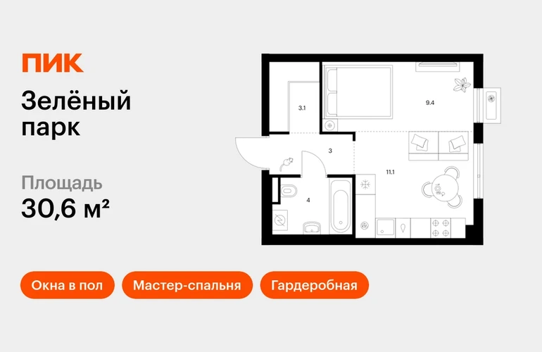 В «Зеленограде» продаётся 1-комнатная квартира квартира площадью 30.6 на 3 этаже 13 этажного дома (корпус, секция) в проекте ПИК «Зелёный парк». Удобное расположение: 20 минут пешком до МЦД-3 «Зеленоград-Крюково». 3 минуты на автомобиле до Кутузовского шоссе, 15 минут до Пятницкого шоссе. 2 минуты пешком до велодрома и лыже-роллерной трассы. 12 минут пешком до Каменского пруда, 7 минут на автомобиле до парка «Зелёный бор». Особенности проекта Масштабный квартал с оригинальной архитектурой в экологичном районе Зеленограда. Проект выглядит современно благодаря уникальным фасадам зданий, которые разработали ведущие российские архитектурные бюро. А удобные и разнообразные планировки позволят каждому выбрать квартиру для собственного сценария жизни. Преимущества проекта: Отделка: Готовая Особенности планировки: Гардеробная, Мастер-спальня, Окна в пол, Умная планировка Светлые просторные лобби с дизайнерской отделкой и бесшумными лифтами. Два детских сада для 250 малышей и две школы для 1100 учеников. Дворы-парки с игровыми и спортивными площадками, местами для отдыха и кофейнями. Пешеходный бульвар для неспешных прогулок и отдыха. Наземные и гостевые паркинги. АртикулО застройщике