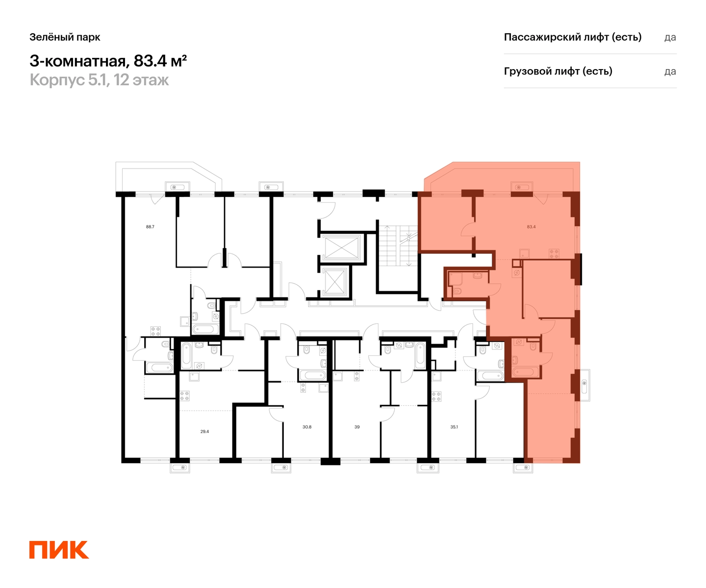 В «Зеленограде» продаётся 3-комнатная квартира квартира площадью 83.4 на 12 этаже 14 этажного дома (корпус, секция) в проекте ПИК «Зелёный парк». Удобное расположение: 20 минут пешком до МЦД-3 «Зеленоград-Крюково». 3 минуты на автомобиле до Кутузовского шоссе, 15 минут до Пятницкого шоссе. 2 минуты пешком до велодрома и лыже-роллерной трассы. 12 минут пешком до Каменского пруда, 7 минут на автомобиле до парка «Зелёный бор». Особенности проекта Масштабный квартал с оригинальной архитектурой в экологичном районе Зеленограда. Проект выглядит современно благодаря уникальным фасадам зданий, которые разработали ведущие российские архитектурные бюро. А удобные и разнообразные планировки позволят каждому выбрать квартиру для собственного сценария жизни. Преимущества проекта: Отделка: Светлые просторные лобби с дизайнерской отделкой и бесшумными лифтами. Два детских сада для 250 малышей и две школы для 1100 учеников. Дворы-парки с игровыми и спортивными площадками, местами для отдыха и кофейнями. Пешеходный бульвар для неспешных прогулок и отдыха. Наземные и гостевые паркинги. АртикулО застройщике