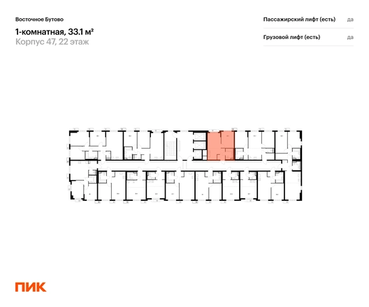В Ленинский район Московской области продаётся 1-комнатная квартира квартира площадью 33.1 на 22 этаже 25 этажного дома (корпус 47, секция 3) в проекте ПИК «Восточное Бутово». Удобное расположение 20 минут на автомобиле до станций метро и МЦД «Бульвар Дмитрия Донского». 10 минут на машине до МКАД. 5 минут пешком до Бутовского лесопарка. 20 минут на автомобиле до ТЦ «Витте Молл», «Твой Дом» и ТРЦ VEGAS. Особенности проекта «Восточное Бутово» — масштабный квартал с готовой инфраструктурой в зелёном районе в 5 км от МКАД. В проекте есть вся необходимая инфраструктура. А удобные и разнообразные планировки позволят каждому выбрать квартиру для собственного сценария жизни. Преимущества проекта: Отделка: Предчистовая Особенности планировки: Окна в пол Десять детских садов, четыре школы, две поликлиники на территории проекта. Дворы-парки с местами для отдыха, детскими и спортивными площадками. Два пешеходных бульвара для прогулок и отдыха. Магазины, кафе и полезные сервисы на первых этажах домов. Многоуровневый и подземный паркинги. АртикулО застройщике