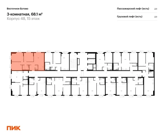 В Ленинский район Московской области продаётся 3-комнатная квартира квартира площадью 68.1 на 15 этаже 25 этажного дома (корпус 48, секция 4) в проекте ПИК «Восточное Бутово». Удобное расположение 20 минут на автомобиле до станций метро и МЦД «Бульвар Дмитрия Донского». 10 минут на машине до МКАД. 5 минут пешком до Бутовского лесопарка. 20 минут на автомобиле до ТЦ «Витте Молл», «Твой Дом» и ТРЦ VEGAS. Особенности проекта «Восточное Бутово» — масштабный квартал с готовой инфраструктурой в зелёном районе в 5 км от МКАД. В проекте есть вся необходимая инфраструктура. А удобные и разнообразные планировки позволят каждому выбрать квартиру для собственного сценария жизни. Преимущества проекта: Отделка: Предчистовая Особенности планировки: Два и более санузла Десять детских садов, четыре школы, две поликлиники на территории проекта. Дворы-парки с местами для отдыха, детскими и спортивными площадками. Два пешеходных бульвара для прогулок и отдыха. Магазины, кафе и полезные сервисы на первых этажах домов. Многоуровневый и подземный паркинги. АртикулО застройщике