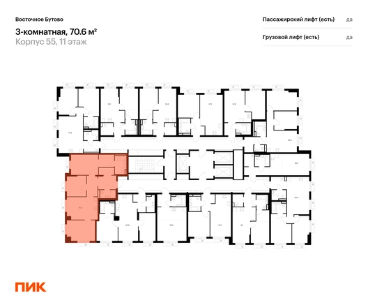 В Ленинский район Московской области продаётся 3-комнатная квартира квартира площадью 70.6 на 11 этаже 25 этажного дома (корпус 55, секция 1) в проекте ПИК «Восточное Бутово». Удобное расположение 20 минут на автомобиле до станций метро и МЦД «Бульвар Дмитрия Донского». 10 минут на машине до МКАД. 5 минут пешком до Бутовского лесопарка. 20 минут на автомобиле до ТЦ «Витте Молл», «Твой Дом» и ТРЦ VEGAS. Особенности проекта «Восточное Бутово» — масштабный квартал с готовой инфраструктурой в зелёном районе в 5 км от МКАД. В проекте есть вся необходимая инфраструктура. А удобные и разнообразные планировки позволят каждому выбрать квартиру для собственного сценария жизни. Преимущества проекта: Отделка: Предчистовая Особенности планировки: Гардеробная, Мастер-спальня, Кухня-ниша, Два и более санузла, Умная планировка Десять детских садов, четыре школы, две поликлиники на территории проекта. Дворы-парки с местами для отдыха, детскими и спортивными площадками. Два пешеходных бульвара для прогулок и отдыха. Магазины, кафе и полезные сервисы на первых этажах домов. Многоуровневый и подземный паркинги. АртикулО застройщике