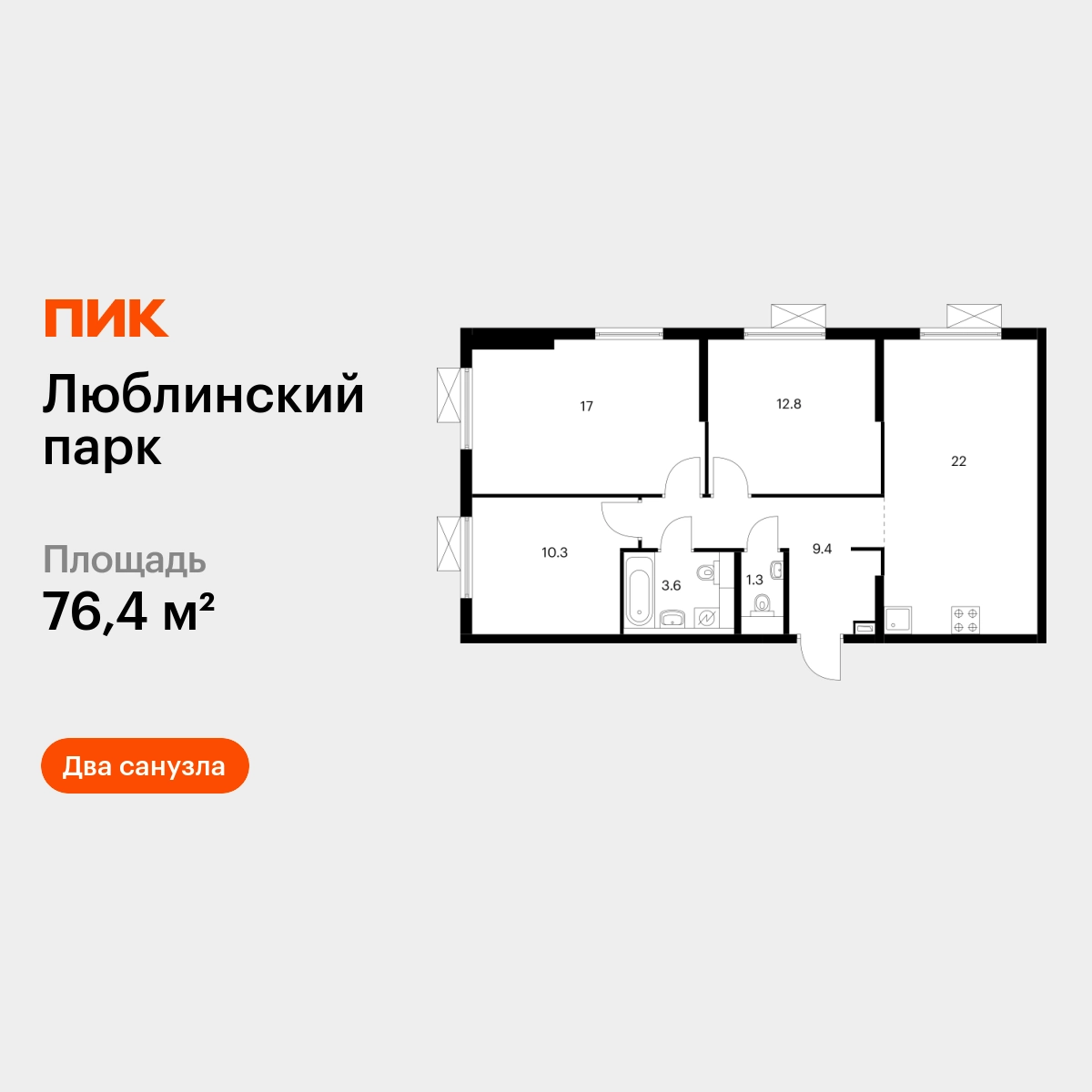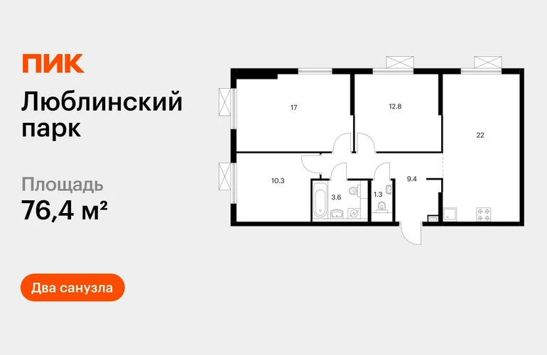 В районе Люблино продаётся 3-комнатная квартира квартира площадью 76.4 на 16 этаже 16 этажного дома (корпус 12, секция 3) в проекте ПИК «Люблинский парк». Удобное расположение 15 минут пешком до станции метро «Братиславская» и МЦД «Перерва». 11 минут на автомобиле до ЮВХ, 15 минут до МКАД и 19 минут до ТТК. 20 минут пешком до ТЦ «Люблино Молл». 15 минут пешком до БЛК «Марьино» и 15 минут на автомобиле до Люблинского парка. Особенности проекта «Люблинский парк» — масштабный квартал с собственной инфраструктурой на юго-востоке Москвы. В проекте будет вся необходимая инфраструктура. А удобные и разнообразные планировки позволят каждому выбрать квартиру для собственного сценария жизни. Преимущества проекта: Отделка: Готовая Особенности планировки: Два и более санузла, Кухня-гостиная Три школы, семь детских садов и поликлиника на территории проекта. Дворы-парки с местами для отдыха, детскими и спортивными площадками. Пешеходный бульвар для прогулок и отдыха. PlayHub «Остров» — большая игровая площадка для детей разного возраста. На первых этажах домов — магазины, кафе и полезные сервисы. Подземный паркинг. АртикулО застройщике