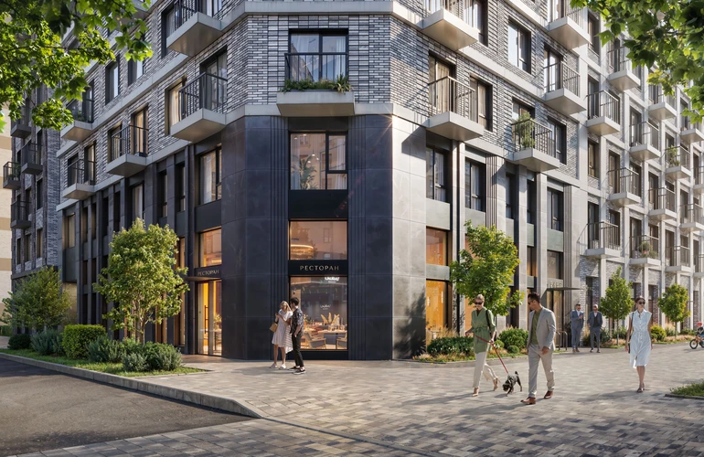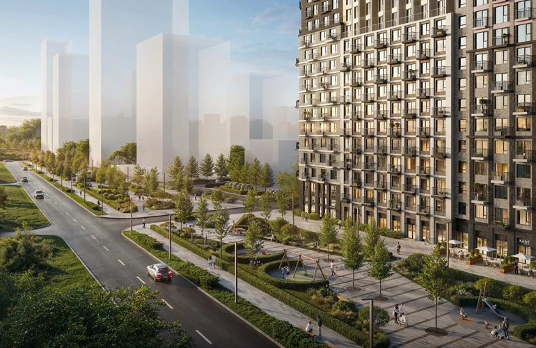 Проект частично реализован: дома первой очереди заселены, на первых этажах открыты магазины и кафе, благоустроены дворы-парки с игровыми и спортивными площадками. Скоро у жителей проекта появится своя школа и детский сад, а через весь квартал протянется длинный пешеходный бульвар для прогулок и отдыха.