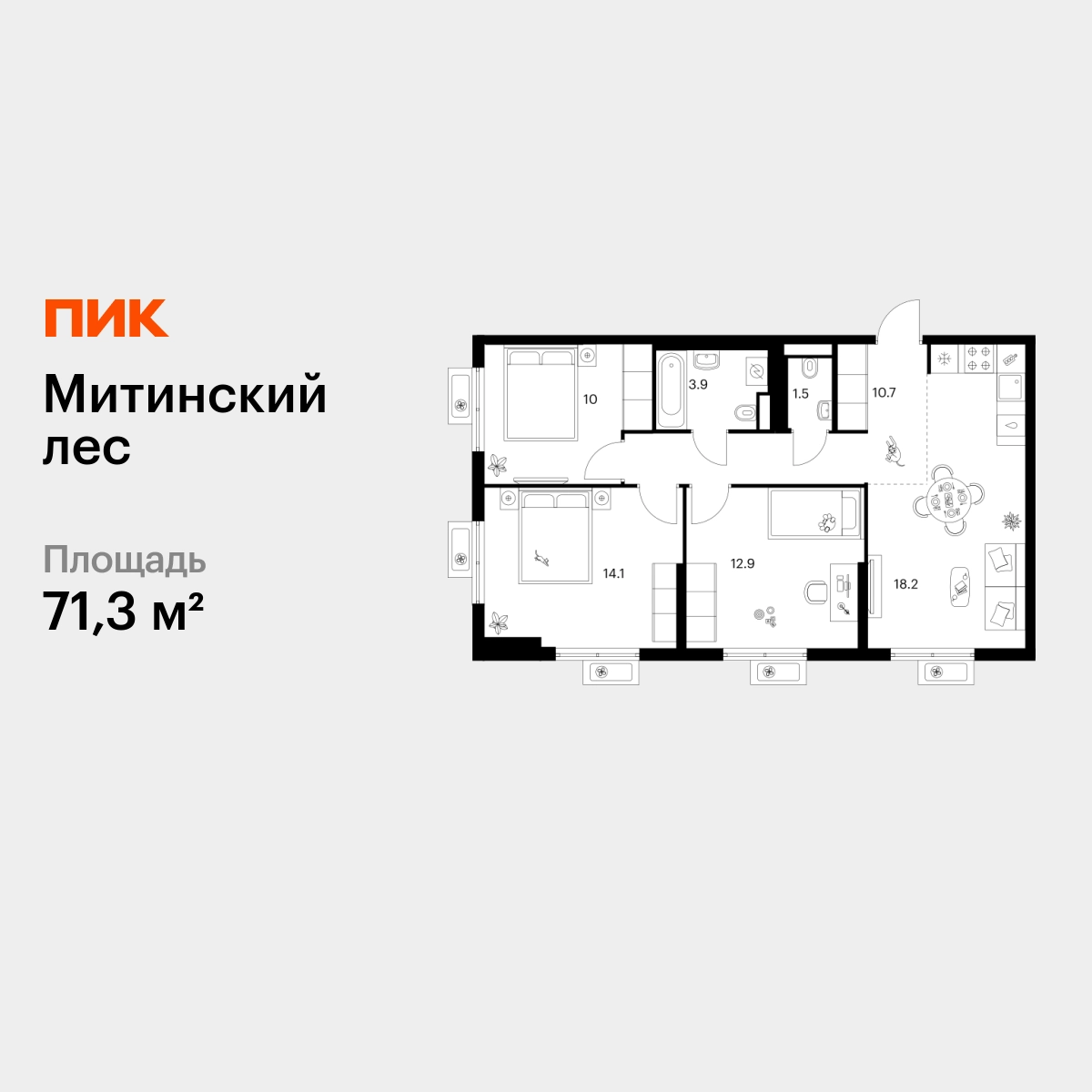 В районе Митино продаётся 3-комнатная квартира квартира площадью 71.3 на 3 этаже 27 этажного дома (корпус 14, секция 4) в проекте ПИК «Митинский лес». Удобное расположение 20 минут пешком до станции метро «Пятницкое шоссе». 8 минут на автомобиле до Пятницкого шоссе и 30 минут до центра Москвы. 11 минут на машине до гипермаркета «Глобус» и крупных фитнес-клубов. 3 минуты пешком до Митинского парка. Особенности проекта «Митинский лес» — квартал в зелёном районе Митино в окружении парков и рек. В проекте будет вся необходимая инфраструктура. А удобные и разнообразные планировки позволят каждому выбрать квартиру для собственного сценария жизни. Преимущества проекта: Отделка: Два детских сада на 150 и 235 мест и школа для 1100 учеников на территории проекта. Дворы-парки с местами для отдыха, детскими и спортивными площадками. Пешеходный бульвар для прогулок и отдыха. Магазины, кафе и полезные сервисы на первых этажах домов. Подземные паркинги. АртикулО застройщике