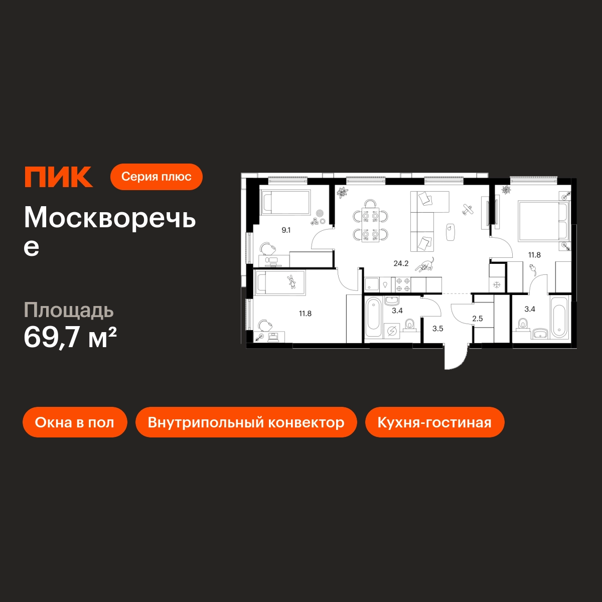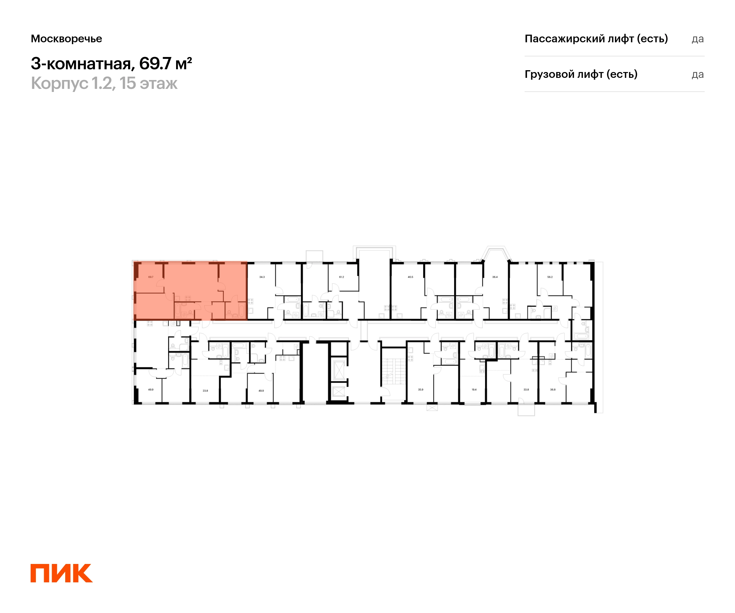 В районе Москворечье-Сабурово продаётся 3-комнатная квартира квартира площадью 69.7 кв. м на 15 этаже 17 этажного дома (корпус, секция) в проекте ПИК «Москворечье». Удобное расположение 18 минут пешком до станции метро «Каширская» и 19 минут до метро «Чертановская». 1 минута на автомобиле до ЮВХ, 13 минут до ТТК и 15 минут до МКАД. 15 минут пешком до ТРК «Москворечье» и 27 минут до ТДЦ «Варшавский». 16 минут пешком до «Долины реки Чертановки» и 30 минут до парка «Коломенское». Особенности проекта «Москворечье» — масштабный проект с авторской архитектурой в Москворечье-Сабурово. Здесь создана качественная среда для полноценной жизни, работы и отдыха. А удобные и разнообразные планировки позволят каждому выбрать квартиру для собственного сценария жизни. Преимущества проекта: Отделка: Готовая Особенности планировки: Гардеробная, Мастер-спальня, Разнесенные спальни, Кухня-гостиная, Два и более санузла, Окна в пол, Внутрипольные конвекторы, Умная планировка Дизайнерские лобби с быстрыми и тихими лифтами, зонами ожидания и колясочными. Два детсада на 350 мест каждый, школа на 1350 мест и поликлиника на территории проекта. Пешеходный бульвар с местами для отдыха, игровыми и спортивными площадками. Первые этажи с пешеходными галереями, магазинами, кафе и полезными сервисами. Подземный паркинг для автомобилей и мотоциклов. Артикул _О застройщике
