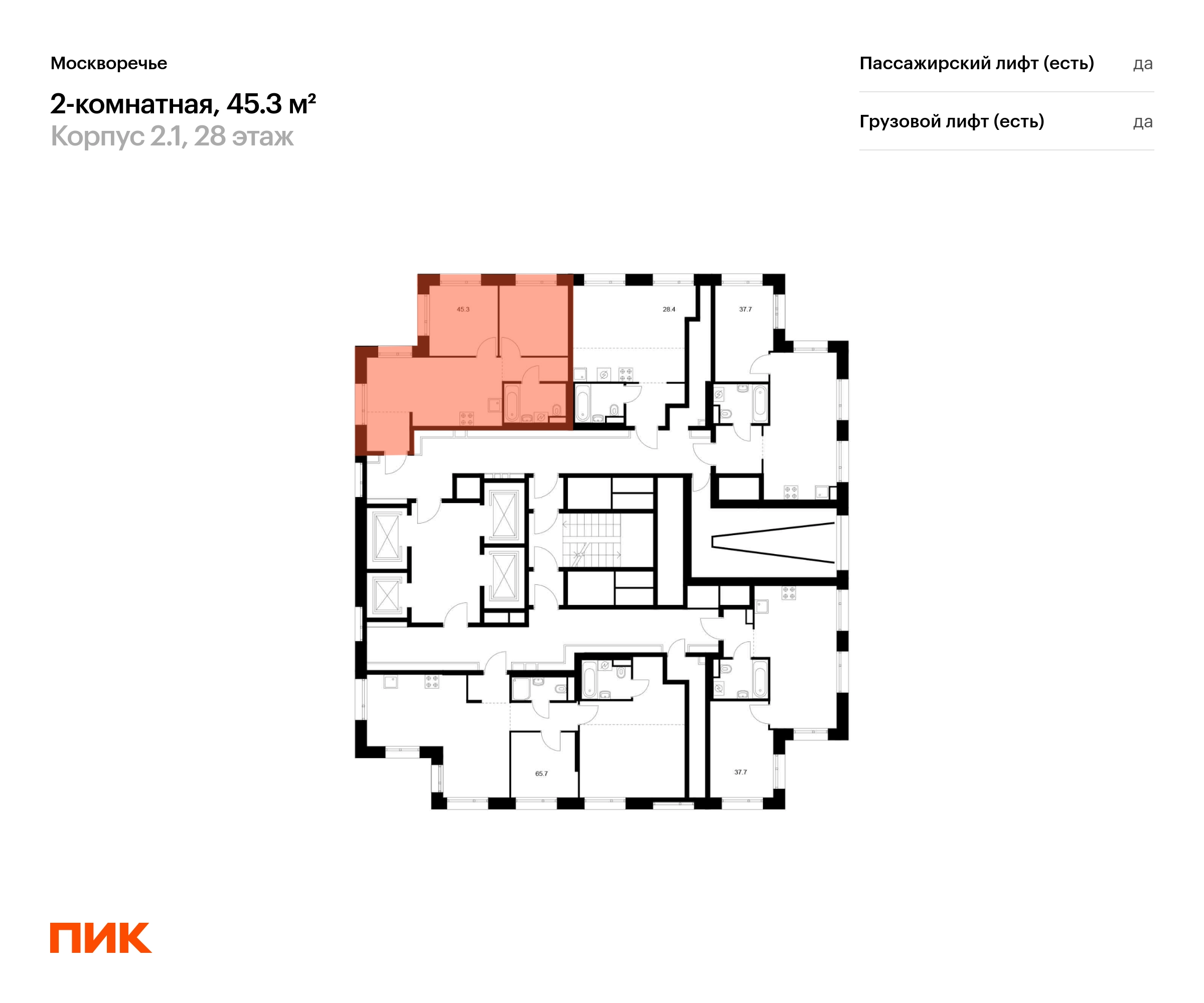 В районе Москворечье-Сабурово продаётся 2-комнатная квартира квартира площадью 45.3 кв. м на 28 этаже 29 этажного дома (корпус, секция) в проекте ПИК «Москворечье». Удобное расположение 18 минут пешком до станции метро «Каширская» и 19 минут до метро «Чертановская». 1 минута на автомобиле до ЮВХ, 13 минут до ТТК и 15 минут до МКАД. 15 минут пешком до ТРК «Москворечье» и 27 минут до ТДЦ «Варшавский». 16 минут пешком до «Долины реки Чертановки» и 30 минут до парка «Коломенское». Особенности проекта «Москворечье» — масштабный проект с авторской архитектурой в Москворечье-Сабурово. Здесь создана качественная среда для полноценной жизни, работы и отдыха. А удобные и разнообразные планировки позволят каждому выбрать квартиру для собственного сценария жизни. Преимущества проекта: Отделка: Дизайнерские лобби с быстрыми и тихими лифтами, зонами ожидания и колясочными. Два детсада на 350 мест каждый, школа на 1350 мест и поликлиника на территории проекта. Пешеходный бульвар с местами для отдыха, игровыми и спортивными площадками. Первые этажи с пешеходными галереями, магазинами, кафе и полезными сервисами. Подземный паркинг для автомобилей и мотоциклов. Артикул _О застройщике