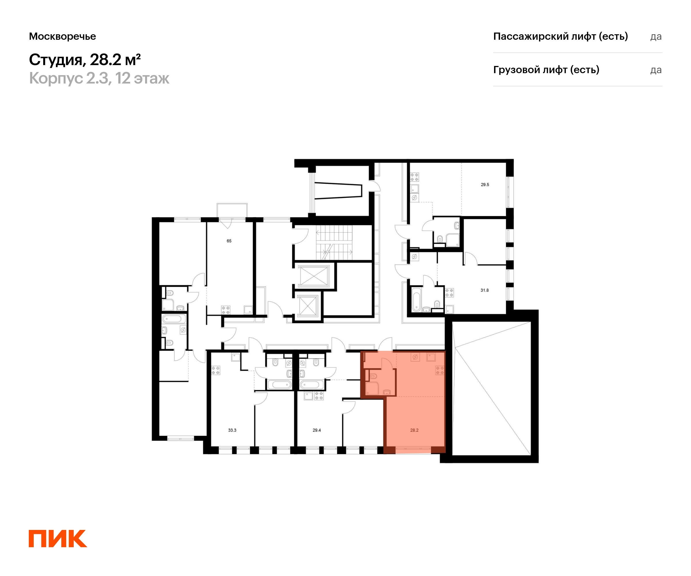 В районе Москворечье-Сабурово продаётся студия квартира площадью 28.2 кв. м на 12 этаже 12 этажного дома (корпус, секция) в проекте ПИК «Москворечье». Удобное расположение 18 минут пешком до станции метро «Каширская» и 19 минут до метро «Чертановская». 1 минута на автомобиле до ЮВХ, 13 минут до ТТК и 15 минут до МКАД. 15 минут пешком до ТРК «Москворечье» и 27 минут до ТДЦ «Варшавский». 16 минут пешком до «Долины реки Чертановки» и 30 минут до парка «Коломенское». Особенности проекта «Москворечье» — масштабный проект с авторской архитектурой в Москворечье-Сабурово. Здесь создана качественная среда для полноценной жизни, работы и отдыха. А удобные и разнообразные планировки позволят каждому выбрать квартиру для собственного сценария жизни. Преимущества проекта: Отделка: Дизайнерские лобби с быстрыми и тихими лифтами, зонами ожидания и колясочными. Два детсада на 350 мест каждый, школа на 1350 мест и поликлиника на территории проекта. Пешеходный бульвар с местами для отдыха, игровыми и спортивными площадками. Первые этажи с пешеходными галереями, магазинами, кафе и полезными сервисами. Подземный паркинг для автомобилей и мотоциклов. Артикул _О застройщике