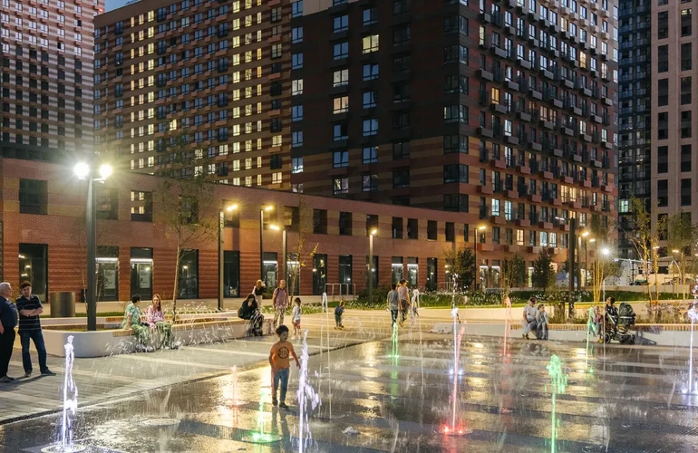 Уже открыта часть пешеходного бульвара, который строится по проекту британского бюро Gillespies. Здесь можно гулять после работы, играть с детьми, заниматься спортом и отдыхать у сухого фонтана с ночной подсветкой. В будущем в кластере появится пешеходный мост, который соединит жилые кварталы.