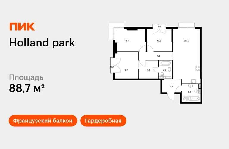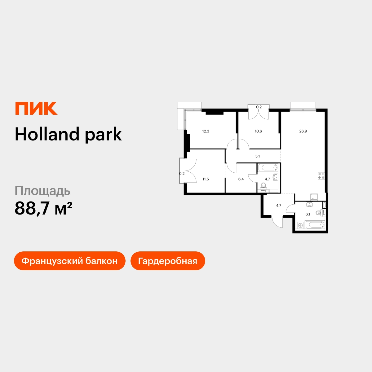 В районе Покровское-Стрешнево продаётся 3-комнатная квартира квартира площадью 88.7 на 13 этаже 14 этажного дома (корпус 8, секция 3) в проекте ПИК Холланд парк.Удобное расположение 5 минут пешком до станции метро «Спартак». 12 минут на автомобиле до ТТК и 15 минут до МКАД. 5 минут пешком до набережной Москвы-реки.