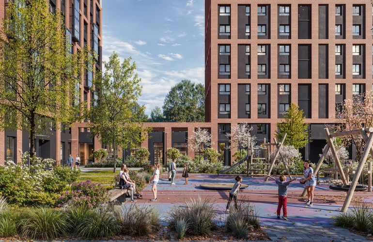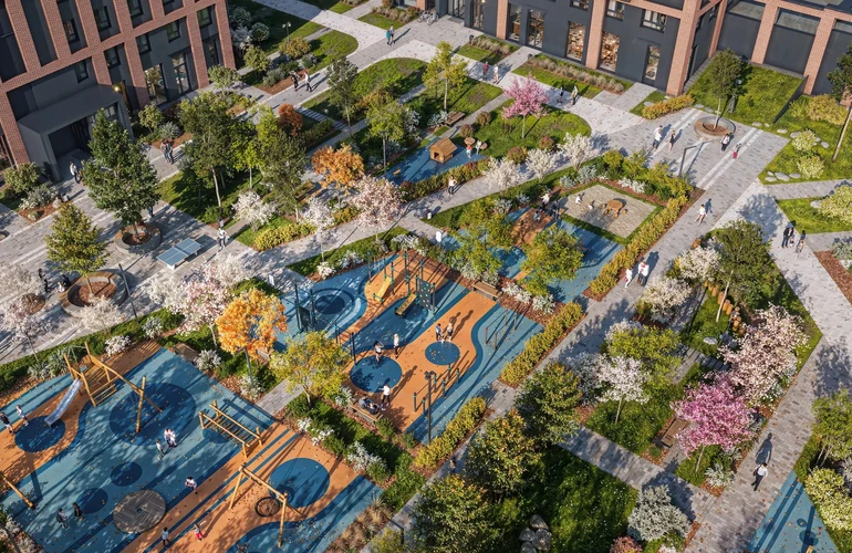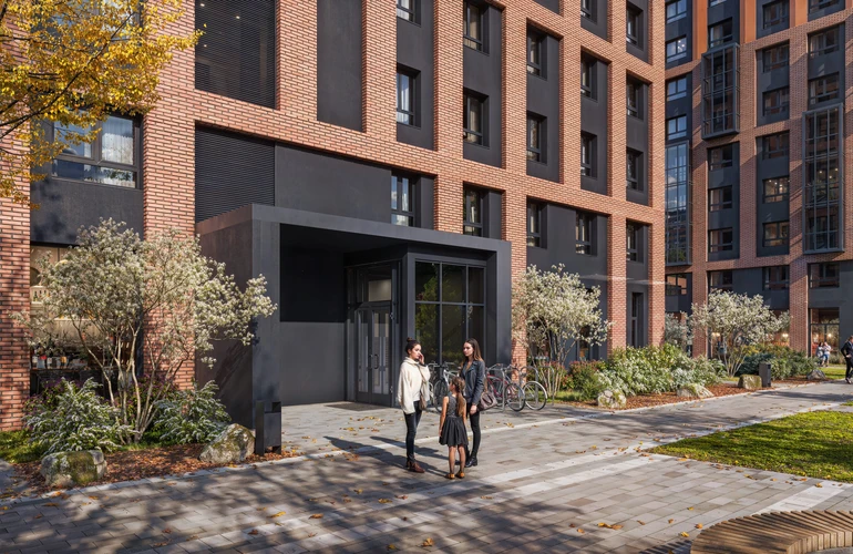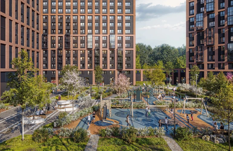 На территории квартала появится собственный детский сад, подземный двухуровневый паркинг, места для спорта, прогулок и отдыха. На первых этажах откроются магазины, кафе и разные полезные сервисы. Во дворах-парках появятся игровые и спортивные площадки. В шаговой доступности от проекта — государственная школа на 350 мест.