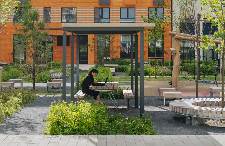 В квартале будет школа с лабораторией по системе Физтеха и два детских сада — один из них уже открыт. В каждом дворе — детские и спортивные площадки с безопасным резиновым покрытием. Через весь район протянется пешеходный бульвар для неспешных прогулок у дома, а на первых этажах домов открыты магазины и полезные сервисы.