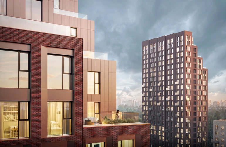 Дизайн лобби на первых этажах домов выполнен в стиле современного минимализма. Для комфорта жителей и их гостей в лобби есть зона ожидания, быстрые тихие лифты и помещение для хранения колясок и велосипедов.