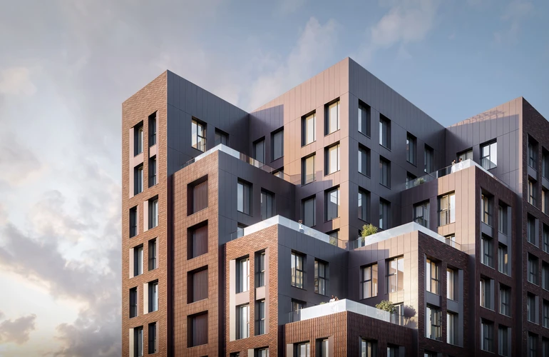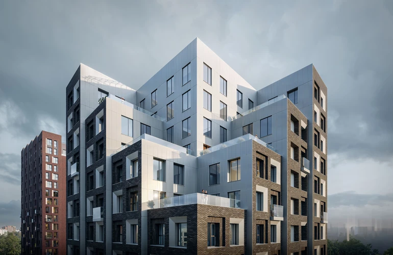 Архитектура квартала навеяна северной природой: разновысотные здания повторяют живописные линии северных скал и высоких хвойных деревьев. Это отражено и в колористике — фасады окрашены в цвета серого гранита, сосновой коры и серебристой глади воды.