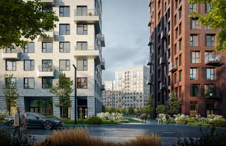 Благоустройство в проекте навеяно северной природой. Через квартал протянется пешеходный бульвар для прогулок и отдыха на свежем воздухе. Во дворах будут ждать зелёные парки с местами для отдыха, детскими и спортивными площадками. На первых этажах домов — торговая аллея с магазинами, кафе и полезными сервисами. А для владельцев автомобилей построим двухуровневый подземный и два наземных паркинга.