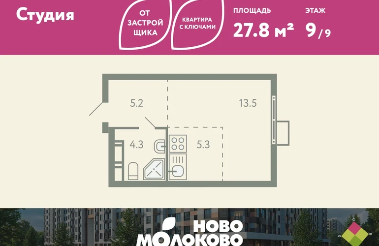 КВАРТИРА С КЛЮЧАМИ! Продается студия в ЖК «Ново-молоково» на 9 этаже, секция 2, площадью 27.80 кв. м. Квартира предчистовой отделкой. Жилой комплекс «Ново-молоково» расположен в экологическом районе ближнего Подмосковья всего в 20 минутах транспортом от метро «Домодедовская». Инфраструктура: - быстрый съезд на Каширское шоссе в сторону Москвы, 20 минут до м. «Домодедовская»; - прямой автобус №367 от ЖК до метро «Домодедовская»; - благоустроенная территория комплекса с прогулочным бульваром, организованными спортивными и детскими площадками; - на территории работают 2 детских сада. Рядом открыта школа с классами «Физтех XXI» от Фонда развития Физтех-школ Московского физико-технического института; - планируется строительство многоуровневой и плоскостной парковки на территории ЖК; - рядом: клуб семейного отдыха, фитнес-центр, горнолыжный курорт, заповедник Горки Ленинские, конно-спортивный комплекс, пляж загородного клуба “Молоково” и другие центры притяжения. Застройка не выше 12 этажей — позволяет сохранить комфортный климат микрорайона, избежав ощущения «каменных джунглей». Свободные планировки, высокие потолки и панорамное остекление отражают современный дизайн комплекса, который также прослеживается и в обустройстве общественных пространств: дворов, игровых площадок и подъездов. В «Ново-Молоково» реализована концепция «двор без машин», что создает дополнительную безопасность для детей и комфорт для жителей. Для автомобилистов организован комфортный наземный паркинг. Успейте приобрести квартиру на выгодных условиях! Чтобы узнать подробности, обращайтесь за консультацией по телефону!О застройщике