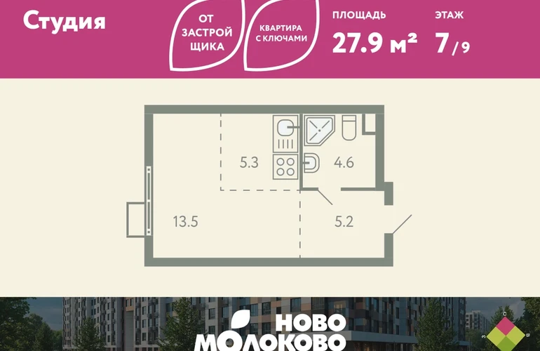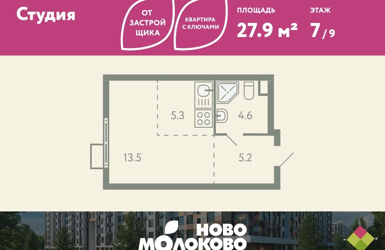 КВАРТИРА С КЛЮЧАМИ! Продается студия в ЖК «Ново-молоково» на 7 этаже, секция 1, площадью 27.90 кв. м. Квартира предчистовой отделкой. Жилой комплекс «Ново-молоково» расположен в экологическом районе ближнего Подмосковья всего в 20 минутах транспортом от метро «Домодедовская». Инфраструктура: - быстрый съезд на Каширское шоссе в сторону Москвы, 20 минут до м. «Домодедовская»; - прямой автобус №367 от ЖК до метро «Домодедовская»; - благоустроенная территория комплекса с прогулочным бульваром, организованными спортивными и детскими площадками; - на территории работают 2 детских сада. Рядом открыта школа с классами «Физтех XXI» от Фонда развития Физтех-школ Московского физико-технического института; - планируется строительство многоуровневой и плоскостной парковки на территории ЖК; - рядом: клуб семейного отдыха, фитнес-центр, горнолыжный курорт, заповедник Горки Ленинские, конно-спортивный комплекс, пляж загородного клуба “Молоково” и другие центры притяжения. Застройка не выше 12 этажей — позволяет сохранить комфортный климат микрорайона, избежав ощущения «каменных джунглей». Свободные планировки, высокие потолки и панорамное остекление отражают современный дизайн комплекса, который также прослеживается и в обустройстве общественных пространств: дворов, игровых площадок и подъездов. В «Ново-Молоково» реализована концепция «двор без машин», что создает дополнительную безопасность для детей и комфорт для жителей. Для автомобилистов организован комфортный наземный паркинг. Успейте приобрести квартиру на выгодных условиях! Чтобы узнать подробности, обращайтесь за консультацией по телефону!О застройщике