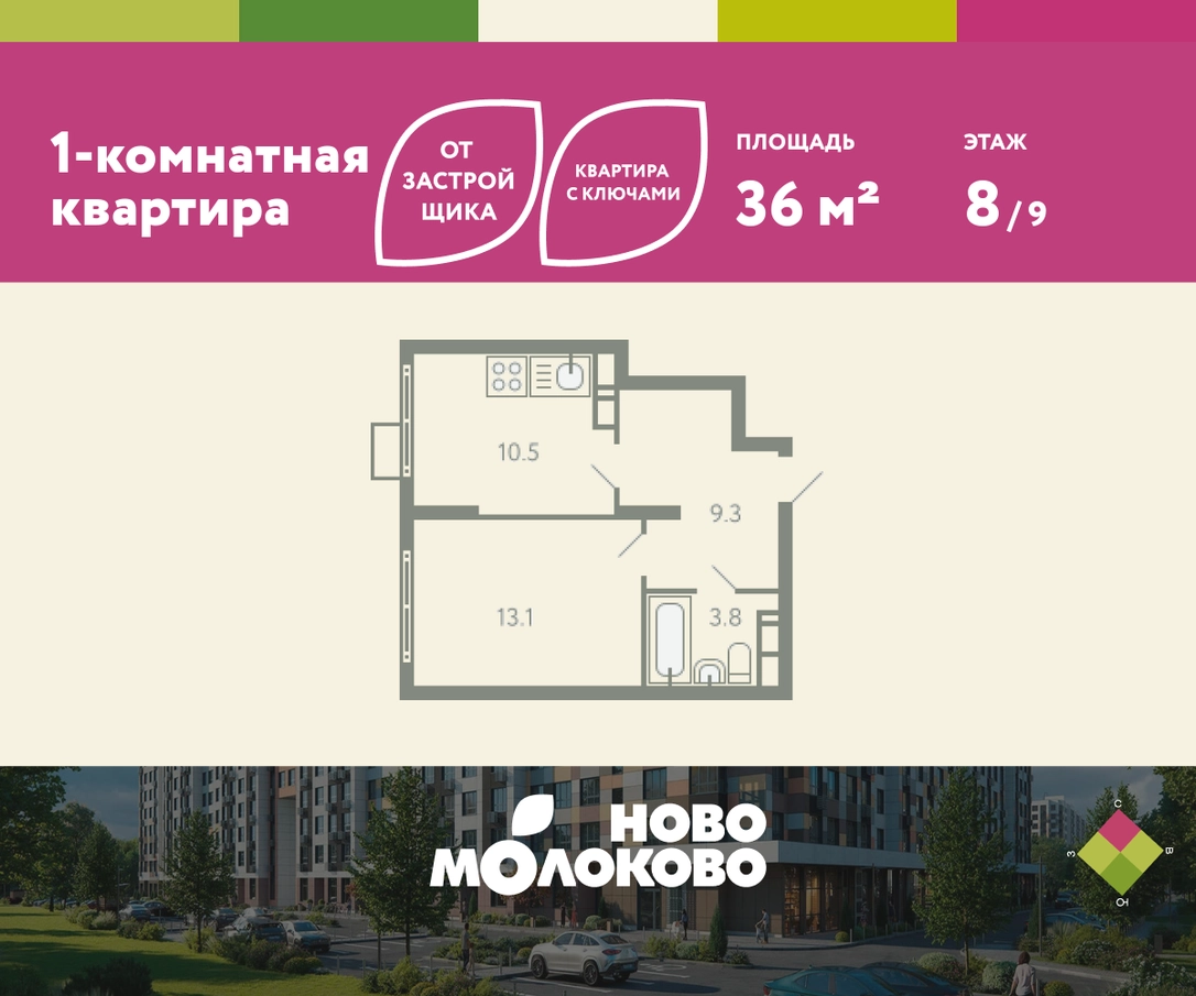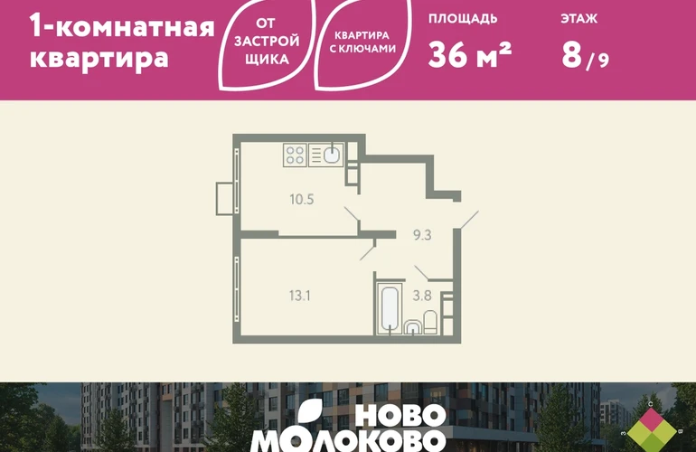КВАРТИРА С КЛЮЧАМИ! Продается 1-комнатная квартира в ЖК «Ново-молоково» на 8 этаже, секция 9, площадью 36.00 кв. м. Квартира предчистовой отделкой. Жилой комплекс «Ново-молоково» расположен в экологическом районе ближнего Подмосковья всего в 20 минутах транспортом от метро «Домодедовская». Инфраструктура: - быстрый съезд на Каширское шоссе в сторону Москвы, 20 минут до м. «Домодедовская»; - прямой автобус №367 от ЖК до метро «Домодедовская»; - благоустроенная территория комплекса с прогулочным бульваром, организованными спортивными и детскими площадками; - на территории работают 2 детских сада. Рядом открыта школа с классами «Физтех XXI» от Фонда развития Физтех-школ Московского физико-технического института; - планируется строительство многоуровневой и плоскостной парковки на территории ЖК; - рядом: клуб семейного отдыха, фитнес-центр, горнолыжный курорт, заповедник Горки Ленинские, конно-спортивный комплекс, пляж загородного клуба “Молоково” и другие центры притяжения. Застройка не выше 12 этажей — позволяет сохранить комфортный климат микрорайона, избежав ощущения «каменных джунглей». Свободные планировки, высокие потолки и панорамное остекление отражают современный дизайн комплекса, который также прослеживается и в обустройстве общественных пространств: дворов, игровых площадок и подъездов. В «Ново-Молоково» реализована концепция «двор без машин», что создает дополнительную безопасность для детей и комфорт для жителей. Для автомобилистов организован комфортный наземный паркинг. Успейте приобрести квартиру на выгодных условиях! Чтобы узнать подробности, обращайтесь за консультацией по телефону!О застройщике