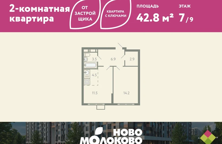 КВАРТИРА С КЛЮЧАМИ! Продается 2-комнатная квартира евроформата в ЖК «Ново-молоково» на 7 этаже, секция 6, площадью 42.80 кв. м. Квартира предчистовой отделкой. Жилой комплекс «Ново-молоково» расположен в экологическом районе ближнего Подмосковья всего в 20 минутах транспортом от метро «Домодедовская». Инфраструктура: - быстрый съезд на Каширское шоссе в сторону Москвы, 20 минут до м. «Домодедовская»; - прямой автобус №367 от ЖК до метро «Домодедовская»; - благоустроенная территория комплекса с прогулочным бульваром, организованными спортивными и детскими площадками; - на территории работают 2 детских сада. Рядом открыта школа с классами «Физтех XXI» от Фонда развития Физтех-школ Московского физико-технического института; - планируется строительство многоуровневой и плоскостной парковки на территории ЖК; - рядом: клуб семейного отдыха, фитнес-центр, горнолыжный курорт, заповедник Горки Ленинские, конно-спортивный комплекс, пляж загородного клуба “Молоково” и другие центры притяжения. Застройка не выше 12 этажей — позволяет сохранить комфортный климат микрорайона, избежав ощущения «каменных джунглей». Свободные планировки, высокие потолки и панорамное остекление отражают современный дизайн комплекса, который также прослеживается и в обустройстве общественных пространств: дворов, игровых площадок и подъездов. В «Ново-Молоково» реализована концепция «двор без машин», что создает дополнительную безопасность для детей и комфорт для жителей. Для автомобилистов организован комфортный наземный паркинг. Успейте приобрести квартиру на выгодных условиях! Чтобы узнать подробности, обращайтесь за консультацией по телефону!О застройщике