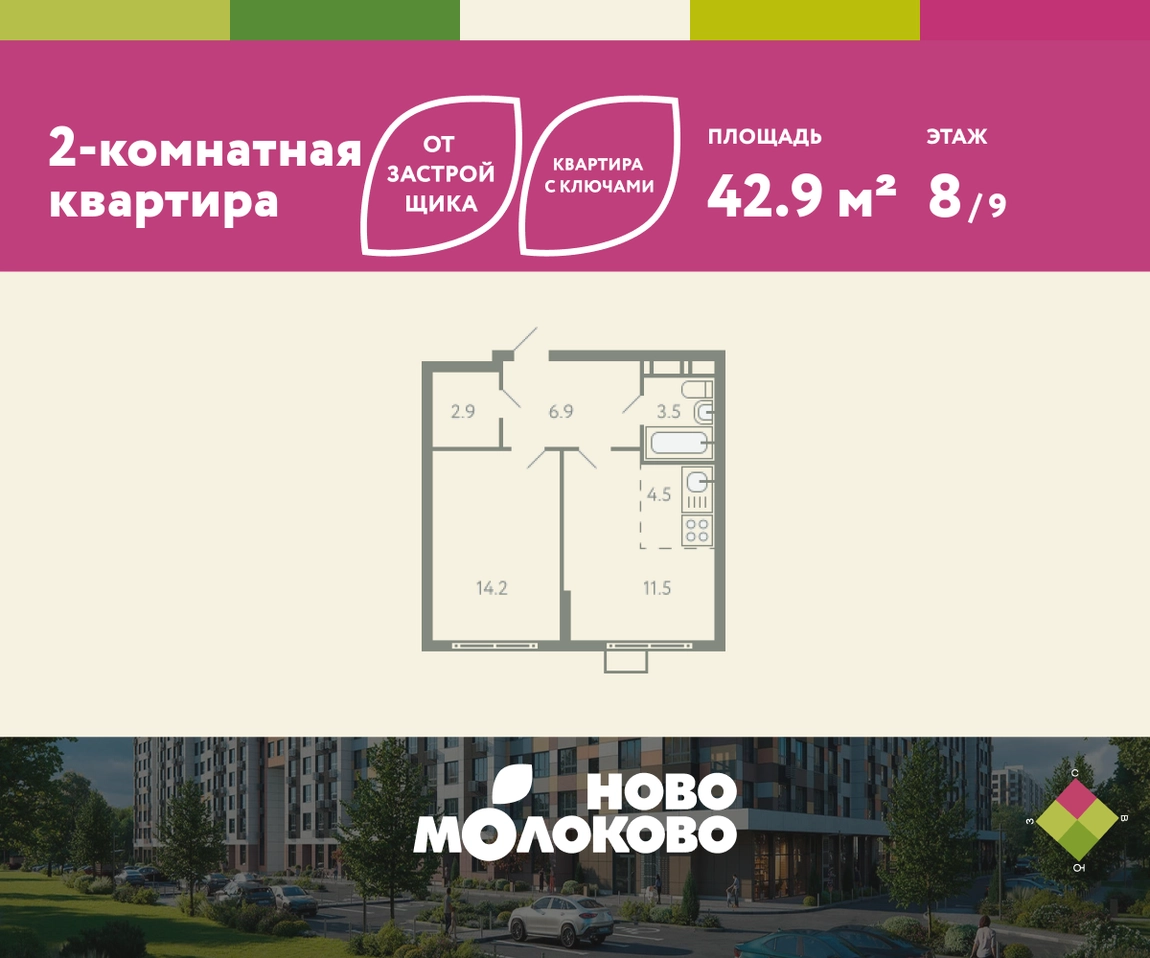 КВАРТИРА С КЛЮЧАМИ! Продается 2-комнатная квартира евроформата в ЖК «Ново-молоково» на 8 этаже, секция 5, площадью 42.90 кв. м. Квартира предчистовой отделкой. Жилой комплекс «Ново-молоково» расположен в экологическом районе ближнего Подмосковья всего в 20 минутах транспортом от метро «Домодедовская». Инфраструктура: - быстрый съезд на Каширское шоссе в сторону Москвы, 20 минут до м. «Домодедовская»; - прямой автобус №367 от ЖК до метро «Домодедовская»; - благоустроенная территория комплекса с прогулочным бульваром, организованными спортивными и детскими площадками; - на территории работают 2 детских сада. Рядом открыта школа с классами «Физтех XXI» от Фонда развития Физтех-школ Московского физико-технического института; - планируется строительство многоуровневой и плоскостной парковки на территории ЖК; - рядом: клуб семейного отдыха, фитнес-центр, горнолыжный курорт, заповедник Горки Ленинские, конно-спортивный комплекс, пляж загородного клуба “Молоково” и другие центры притяжения. Застройка не выше 12 этажей — позволяет сохранить комфортный климат микрорайона, избежав ощущения «каменных джунглей». Свободные планировки, высокие потолки и панорамное остекление отражают современный дизайн комплекса, который также прослеживается и в обустройстве общественных пространств: дворов, игровых площадок и подъездов. В «Ново-Молоково» реализована концепция «двор без машин», что создает дополнительную безопасность для детей и комфорт для жителей. Для автомобилистов организован комфортный наземный паркинг. Успейте приобрести квартиру на выгодных условиях! Чтобы узнать подробности, обращайтесь за консультацией по телефону!О застройщике