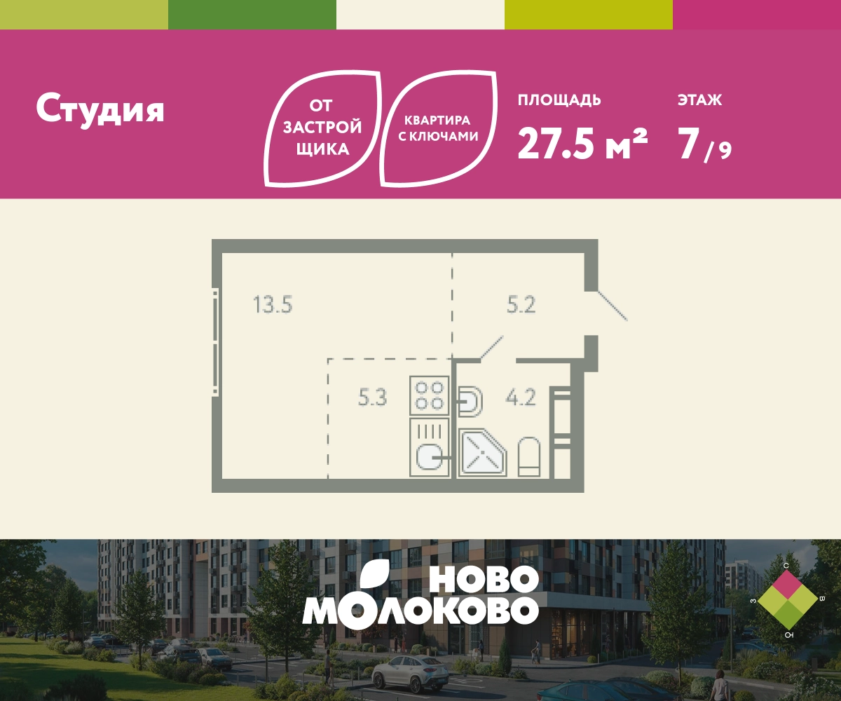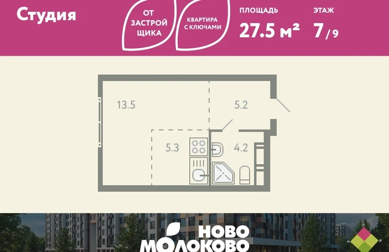 КВАРТИРА С КЛЮЧАМИ! Продается студия в ЖК «Ново-молоково» на 7 этаже, секция 11, площадью 27.50 кв. м. Квартира предчистовой отделкой. Жилой комплекс «Ново-молоково» расположен в экологическом районе ближнего Подмосковья всего в 20 минутах транспортом от метро «Домодедовская». Инфраструктура: - быстрый съезд на Каширское шоссе в сторону Москвы, 20 минут до м. «Домодедовская»; - прямой автобус №367 от ЖК до метро «Домодедовская»; - благоустроенная территория комплекса с прогулочным бульваром, организованными спортивными и детскими площадками; - на территории работают 2 детских сада. Рядом открыта школа с классами «Физтех XXI» от Фонда развития Физтех-школ Московского физико-технического института; - планируется строительство многоуровневой и плоскостной парковки на территории ЖК; - рядом: клуб семейного отдыха, фитнес-центр, горнолыжный курорт, заповедник Горки Ленинские, конно-спортивный комплекс, пляж загородного клуба “Молоково” и другие центры притяжения. Застройка не выше 12 этажей — позволяет сохранить комфортный климат микрорайона, избежав ощущения «каменных джунглей». Свободные планировки, высокие потолки и панорамное остекление отражают современный дизайн комплекса, который также прослеживается и в обустройстве общественных пространств: дворов, игровых площадок и подъездов. В «Ново-Молоково» реализована концепция «двор без машин», что создает дополнительную безопасность для детей и комфорт для жителей. Для автомобилистов организован комфортный наземный паркинг. Успейте приобрести квартиру на выгодных условиях! Чтобы узнать подробности, обращайтесь за консультацией по телефону!О застройщике