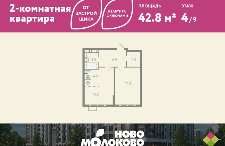 КВАРТИРА С КЛЮЧАМИ! Продается 2-комнатная квартира евроформата в ЖК «Ново-молоково» на 4 этаже, секция 17, площадью 42.80 кв. м. Квартира предчистовой отделкой. Жилой комплекс «Ново-молоково» расположен в экологическом районе ближнего Подмосковья всего в 20 минутах транспортом от метро «Домодедовская». Инфраструктура: - быстрый съезд на Каширское шоссе в сторону Москвы, 20 минут до м. «Домодедовская»; - прямой автобус №367 от ЖК до метро «Домодедовская»; - благоустроенная территория комплекса с прогулочным бульваром, организованными спортивными и детскими площадками; - на территории работают 2 детских сада. Рядом открыта школа с классами «Физтех XXI» от Фонда развития Физтех-школ Московского физико-технического института; - планируется строительство многоуровневой и плоскостной парковки на территории ЖК; - рядом: клуб семейного отдыха, фитнес-центр, горнолыжный курорт, заповедник Горки Ленинские, конно-спортивный комплекс, пляж загородного клуба “Молоково” и другие центры притяжения. Застройка не выше 12 этажей — позволяет сохранить комфортный климат микрорайона, избежав ощущения «каменных джунглей». Свободные планировки, высокие потолки и панорамное остекление отражают современный дизайн комплекса, который также прослеживается и в обустройстве общественных пространств: дворов, игровых площадок и подъездов. В «Ново-Молоково» реализована концепция «двор без машин», что создает дополнительную безопасность для детей и комфорт для жителей. Для автомобилистов организован комфортный наземный паркинг. Успейте приобрести квартиру на выгодных условиях! Чтобы узнать подробности, обращайтесь за консультацией по телефону!О застройщике