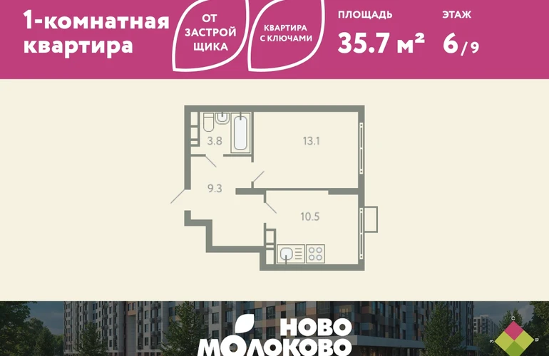КВАРТИРА С КЛЮЧАМИ! Продается 1-комнатная квартира в ЖК «Ново-молоково» на 6 этаже, секция 11, площадью 35.70 кв. м. Квартира предчистовой отделкой. Жилой комплекс «Ново-молоково» расположен в экологическом районе ближнего Подмосковья всего в 20 минутах транспортом от метро «Домодедовская». Инфраструктура: - быстрый съезд на Каширское шоссе в сторону Москвы, 20 минут до м. «Домодедовская»; - прямой автобус №367 от ЖК до метро «Домодедовская»; - благоустроенная территория комплекса с прогулочным бульваром, организованными спортивными и детскими площадками; - на территории работают 2 детских сада. Рядом открыта школа с классами «Физтех XXI» от Фонда развития Физтех-школ Московского физико-технического института; - планируется строительство многоуровневой и плоскостной парковки на территории ЖК; - рядом: клуб семейного отдыха, фитнес-центр, горнолыжный курорт, заповедник Горки Ленинские, конно-спортивный комплекс, пляж загородного клуба “Молоково” и другие центры притяжения. Застройка не выше 12 этажей — позволяет сохранить комфортный климат микрорайона, избежав ощущения «каменных джунглей». Свободные планировки, высокие потолки и панорамное остекление отражают современный дизайн комплекса, который также прослеживается и в обустройстве общественных пространств: дворов, игровых площадок и подъездов. В «Ново-Молоково» реализована концепция «двор без машин», что создает дополнительную безопасность для детей и комфорт для жителей. Для автомобилистов организован комфортный наземный паркинг. Успейте приобрести квартиру на выгодных условиях! Чтобы узнать подробности, обращайтесь за консультацией по телефону!О застройщике