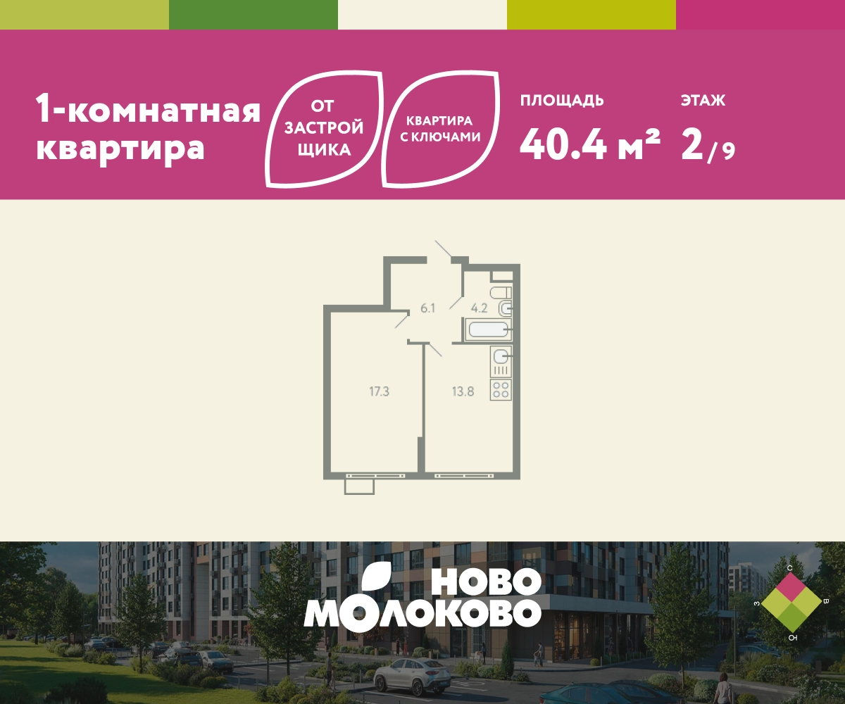 КВАРТИРА С КЛЮЧАМИ! Продается 1-комнатная квартира в ЖК «Ново-молоково» на 2 этаже, секция 7, площадью 40.40 кв. м. Квартира предчистовой отделкой. Жилой комплекс «Ново-молоково» расположен в экологическом районе ближнего Подмосковья всего в 20 минутах транспортом от метро «Домодедовская». Инфраструктура: - быстрый съезд на Каширское шоссе в сторону Москвы, 20 минут до м. «Домодедовская»; - прямой автобус №367 от ЖК до метро «Домодедовская»; - благоустроенная территория комплекса с прогулочным бульваром, организованными спортивными и детскими площадками; - на территории работают 2 детских сада. Рядом открыта школа с классами «Физтех XXI» от Фонда развития Физтех-школ Московского физико-технического института; - планируется строительство многоуровневой и плоскостной парковки на территории ЖК; - рядом: клуб семейного отдыха, фитнес-центр, горнолыжный курорт, заповедник Горки Ленинские, конно-спортивный комплекс, пляж загородного клуба “Молоково” и другие центры притяжения. Застройка не выше 12 этажей — позволяет сохранить комфортный климат микрорайона, избежав ощущения «каменных джунглей». Свободные планировки, высокие потолки и панорамное остекление отражают современный дизайн комплекса, который также прослеживается и в обустройстве общественных пространств: дворов, игровых площадок и подъездов. В «Ново-Молоково» реализована концепция «двор без машин», что создает дополнительную безопасность для детей и комфорт для жителей. Для автомобилистов организован комфортный наземный паркинг. Успейте приобрести квартиру на выгодных условиях! Чтобы узнать подробности, обращайтесь за консультацией по телефону!О застройщике